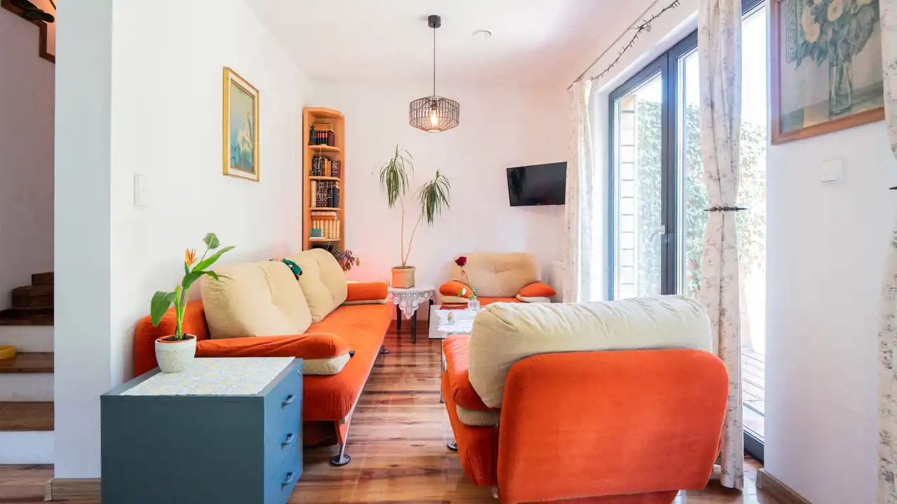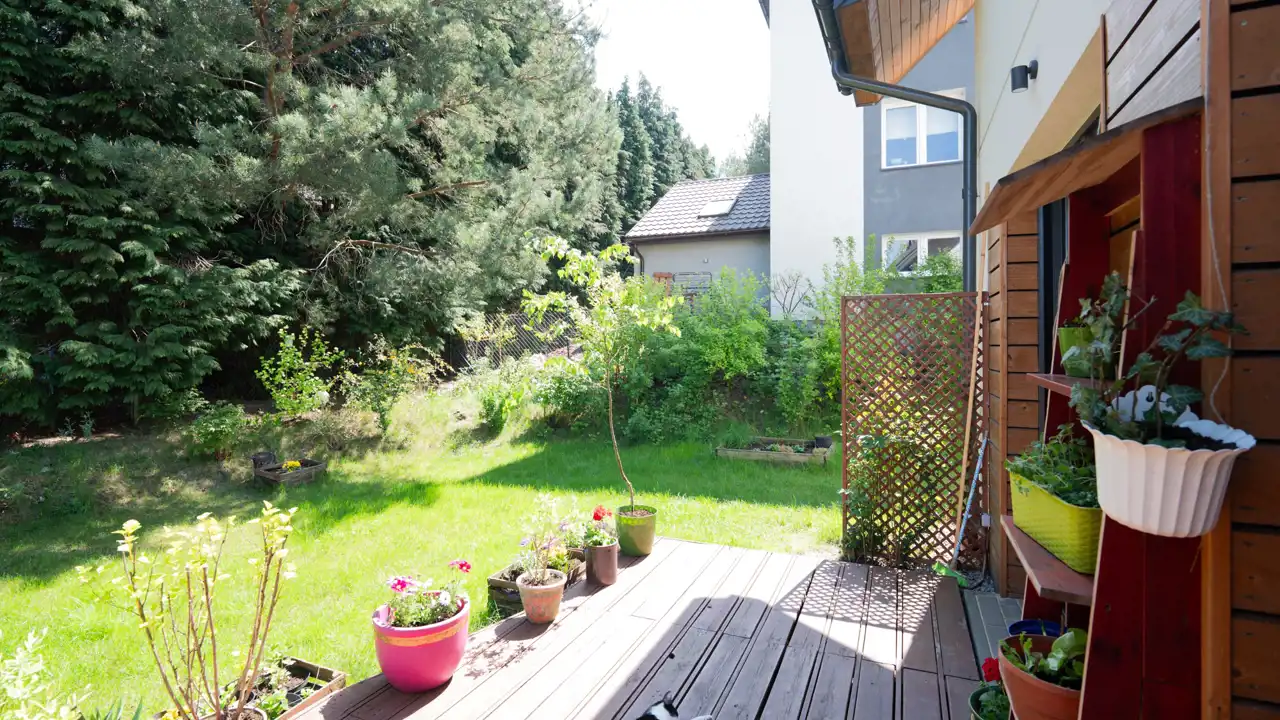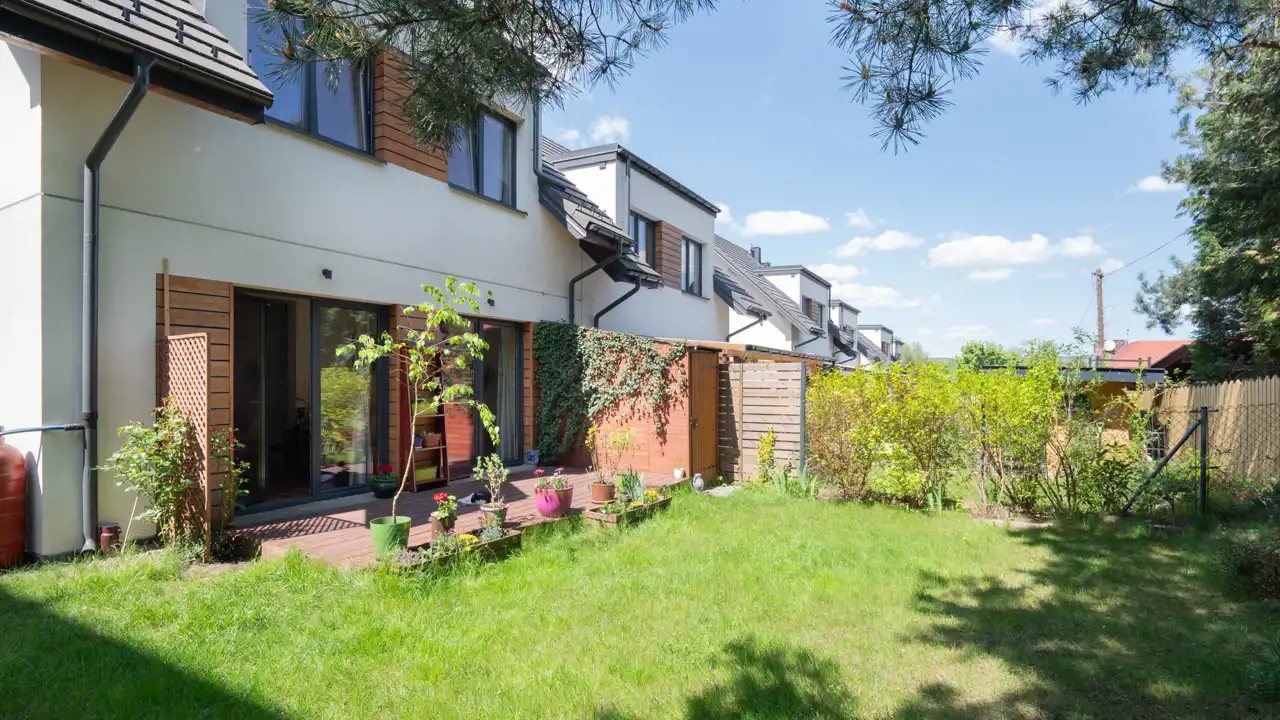 Kameralnie położona działka o pow. 246 m2 jest ogrodzona, bardzo ładnie zagospodarowana, z dużą ilością zieleni, kwiatów, ujęciem wody deszczowej do celów gospodarczych oraz tarasem pokrytym deskami tarasowymi. Możliwość parkowania dwoma samochodami na miejscach przy domu.