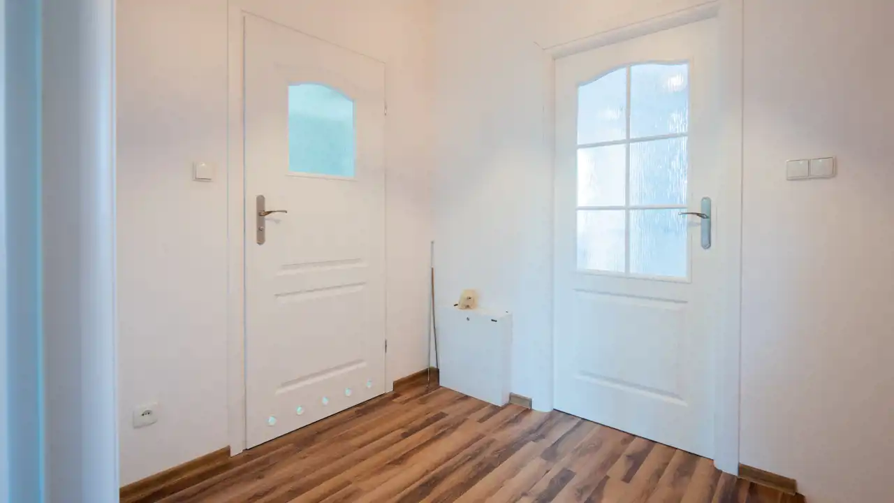 Na podłogach w pokojach wysokiej klasy panele lakierowane, w kuchni, łazienkach i wiatrołapie gres.