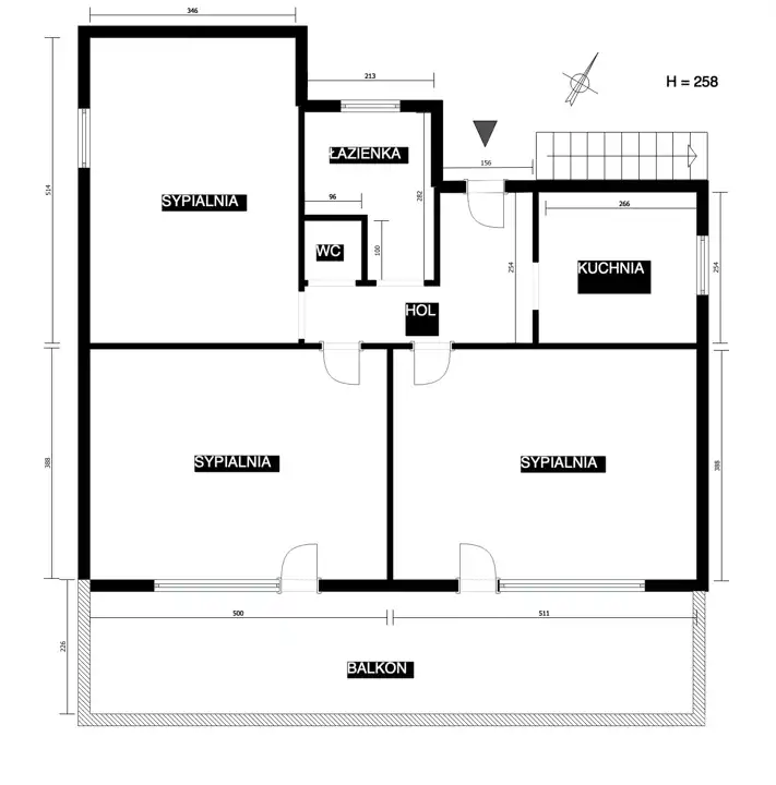 pokój 18 m2, pokój 19 m2, pokój 19 m2, kuchnia 7 m2, łazienka i wc ok. 6 m2, przedpokój 7,5 m2