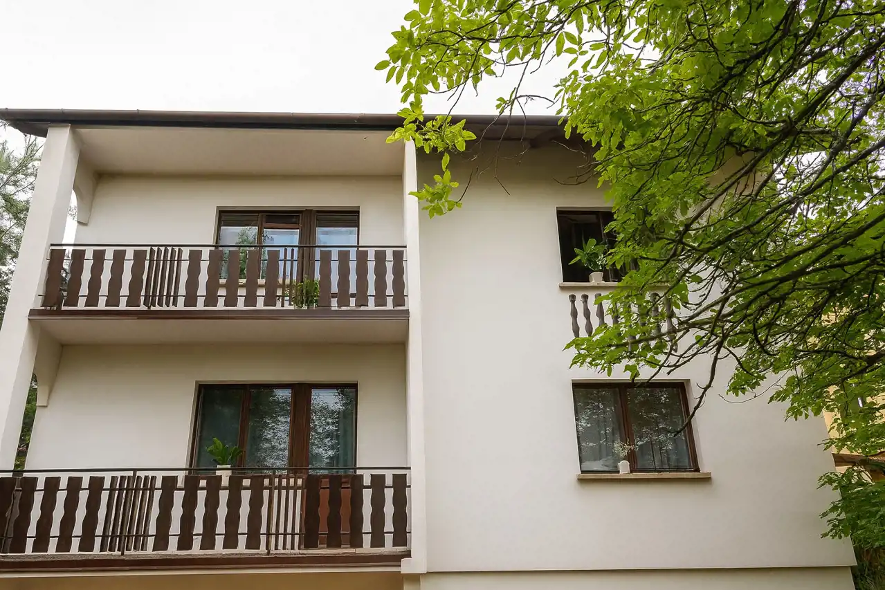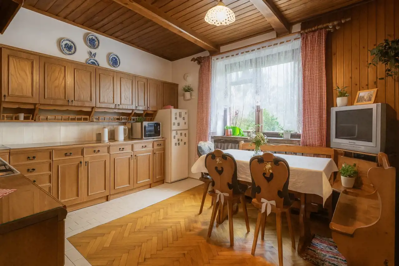 Elewacja w jasnym kolorze, stolarka okienna PCV. Na podłogach położony jest parkiet i płytki
