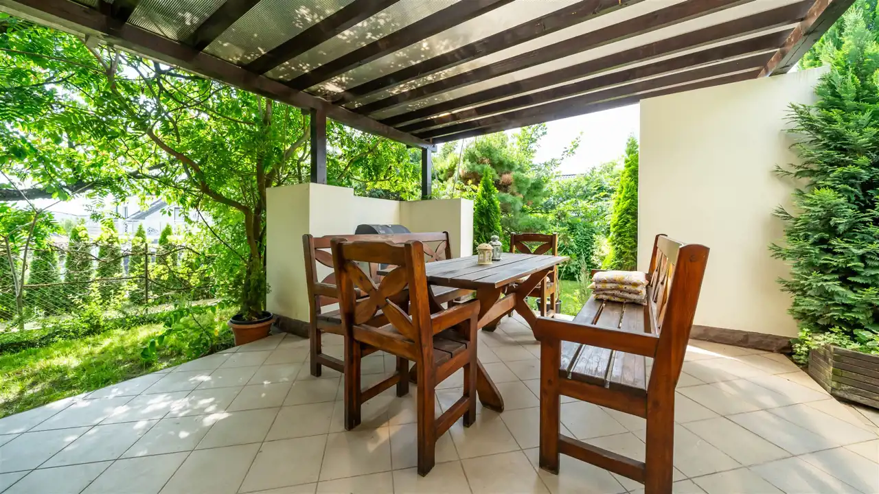 Izolacja wykonana ze styropianu 10 cm, pokryta tynkiem akrylowym. Ponieważ dom posiada dwa niezależne wejścia, może być do wykorzystania przez np dwie rodziny.