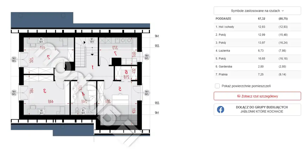 Poddasze: schody i hol (12,93m2), pokój (12,99m2), pokój (13,97m2), pokój (10,65m2), garderoba (2,8m2), łazienka (6,73m2), pralnia (7,25m2) - razem 67,32m2