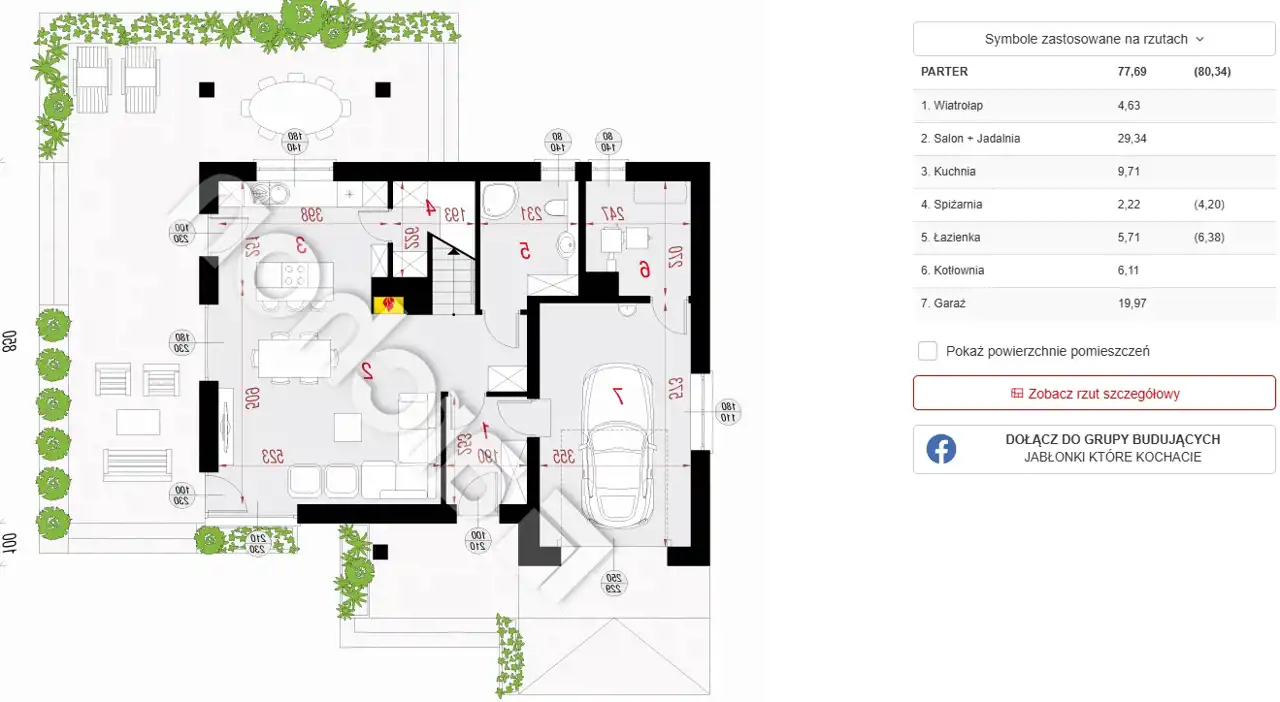 Parter: wiatrołap (4,63m2), salon + jadalnia (29,34m2), kuchnia (9,71m2), spiżarnia (2,22m2), łazienka (5,71m2). kotłownia (6,11m2), garaż (19,97m2) - razem 77,69m2