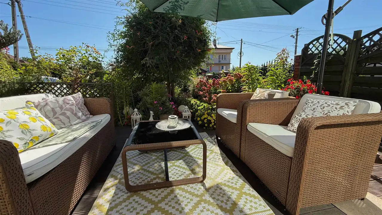 Urządzony Taras oraz Urokliwy Ogród dodatkowo cieszą oko i pozwalają miło spędzać czas, na końcu działki został wydzielony mały sad z blaszanym garażem.