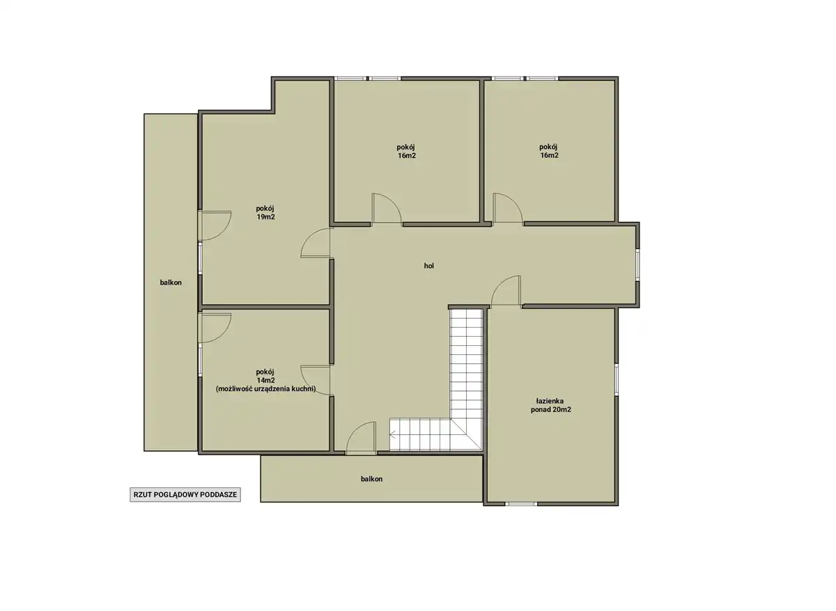 Piętro: 4 niezależne sypialnie (19 m2,16 m2,16 m2,15 m2), duża łazienka (ponad 20 m2) - do wykończenia, przestronna komunikacja.