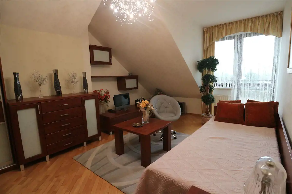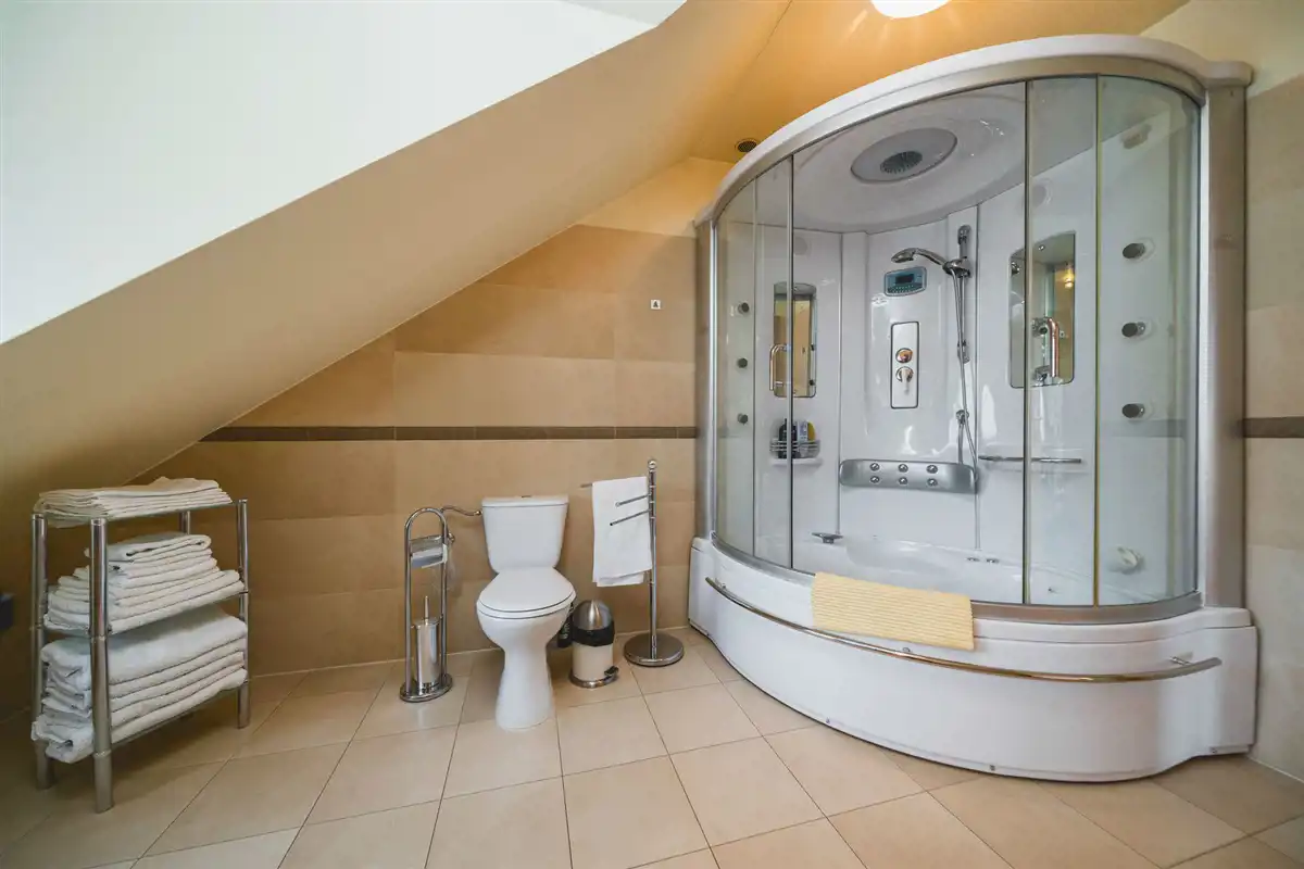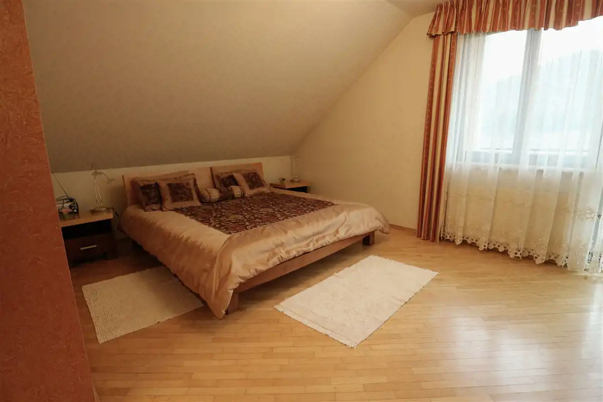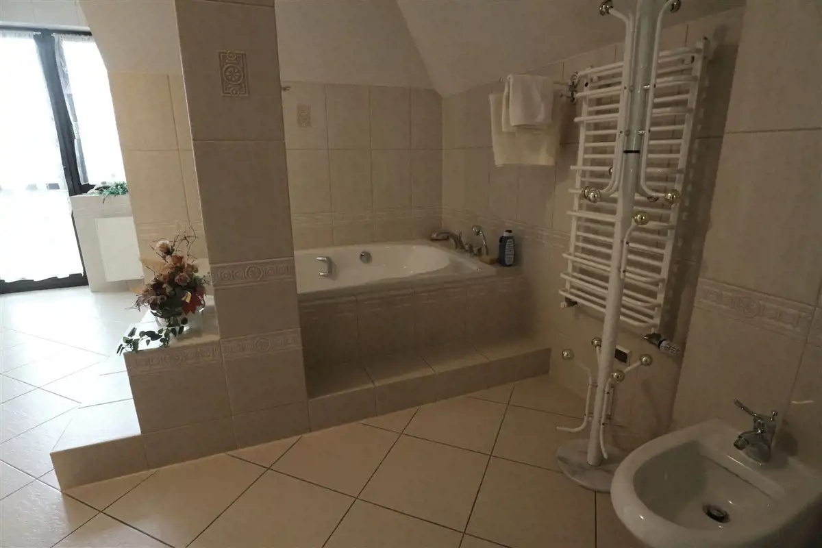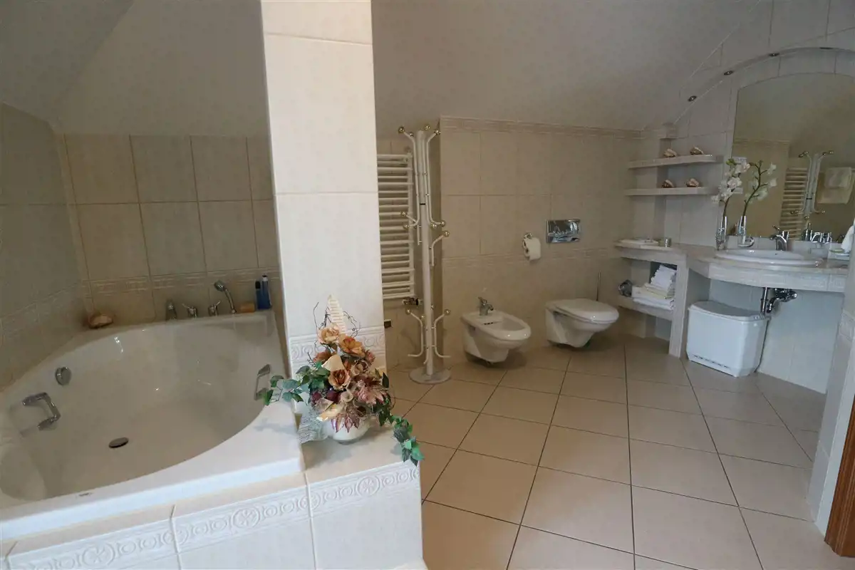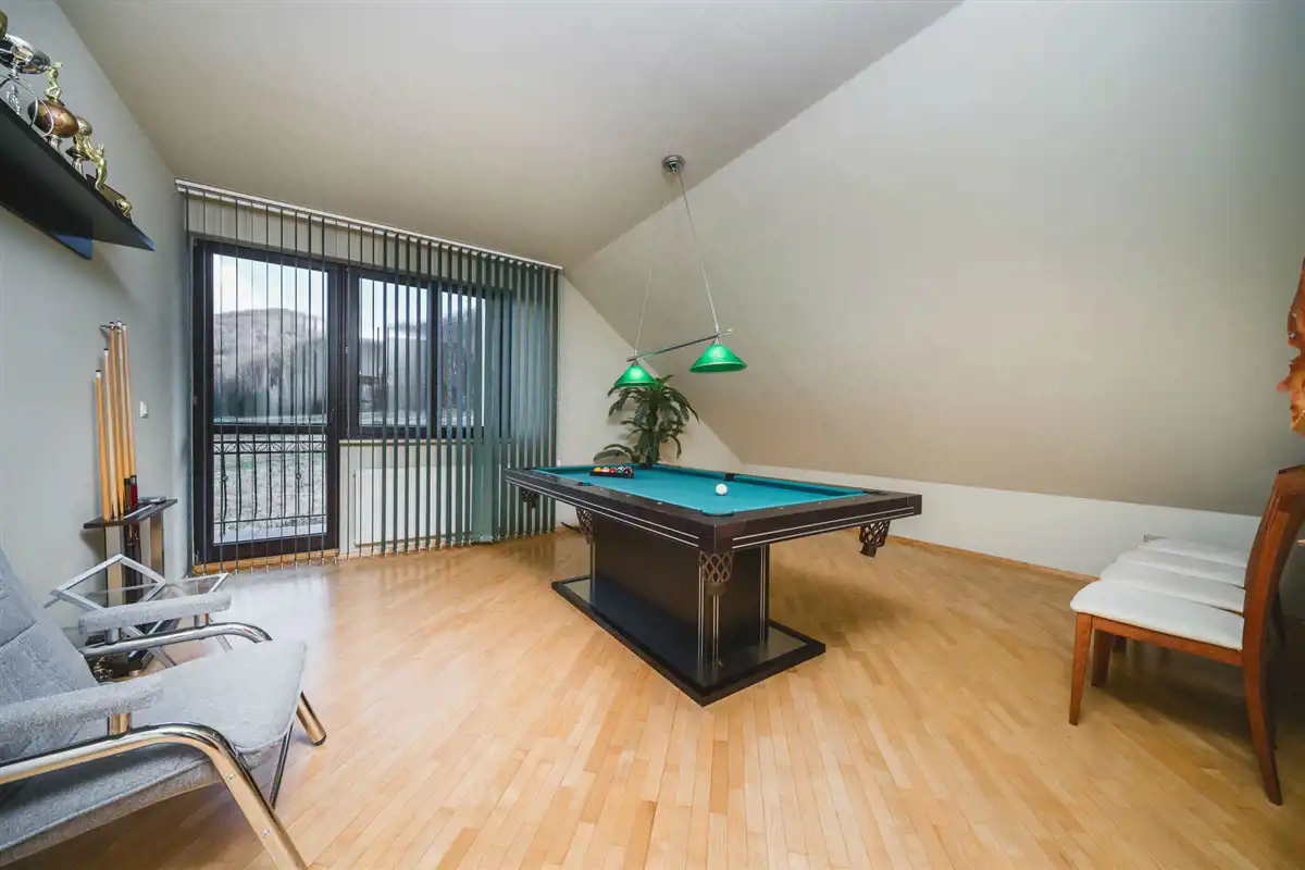 pokój kąpielowy z wanną, pokój bilardowy, dwie sypialnie, miejsce na czytelnię.