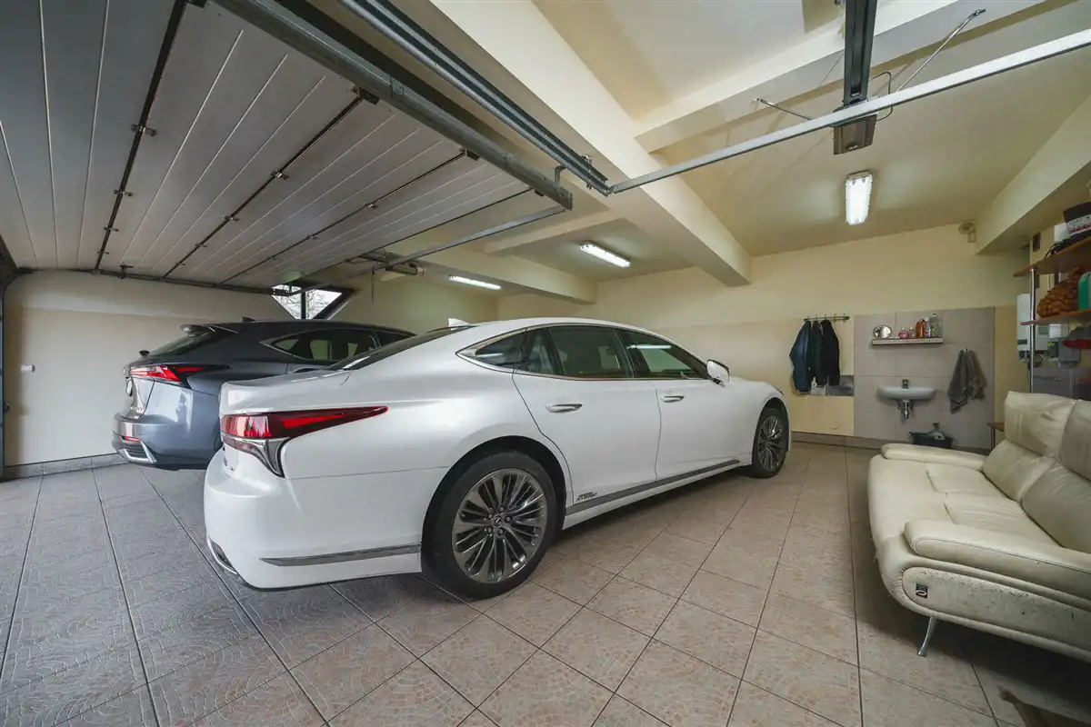Dom ma szeroki i wygodny podjazd, możliwość parkowania w garażu dwóch samochodów i kilku przed garażem.