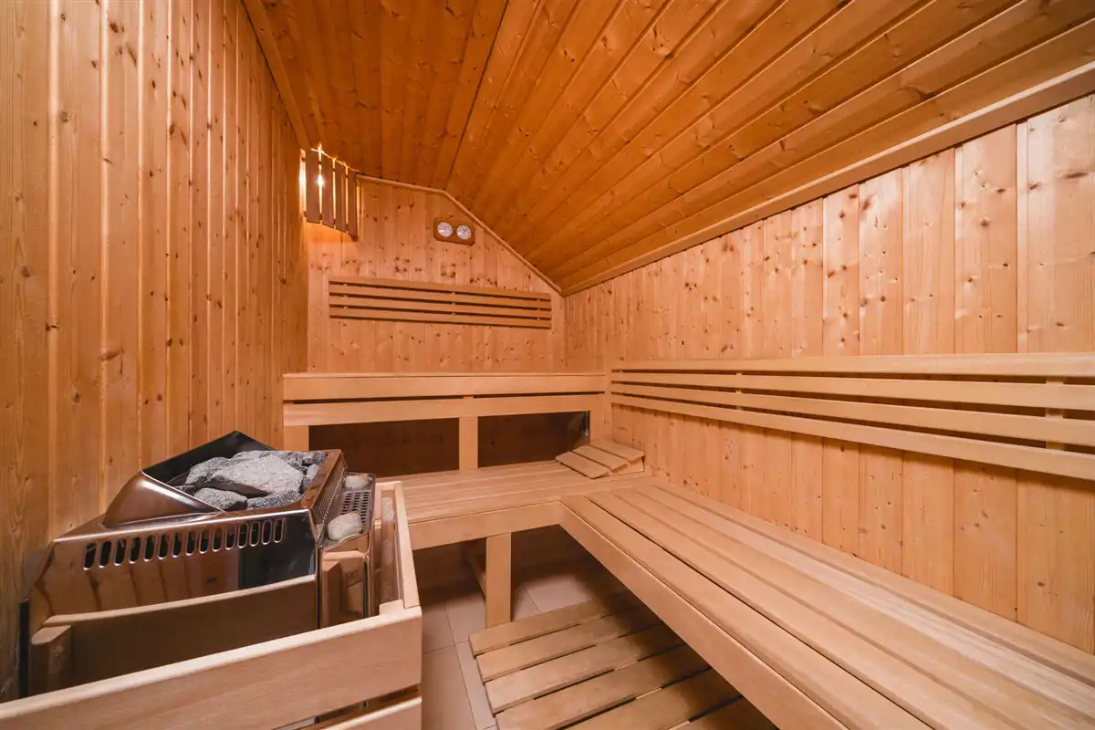 Przejście do dwustanowiskowego garażu nad którym jest pokój rekreacyjny z sauną suchą i mokrą oraz łazienką.