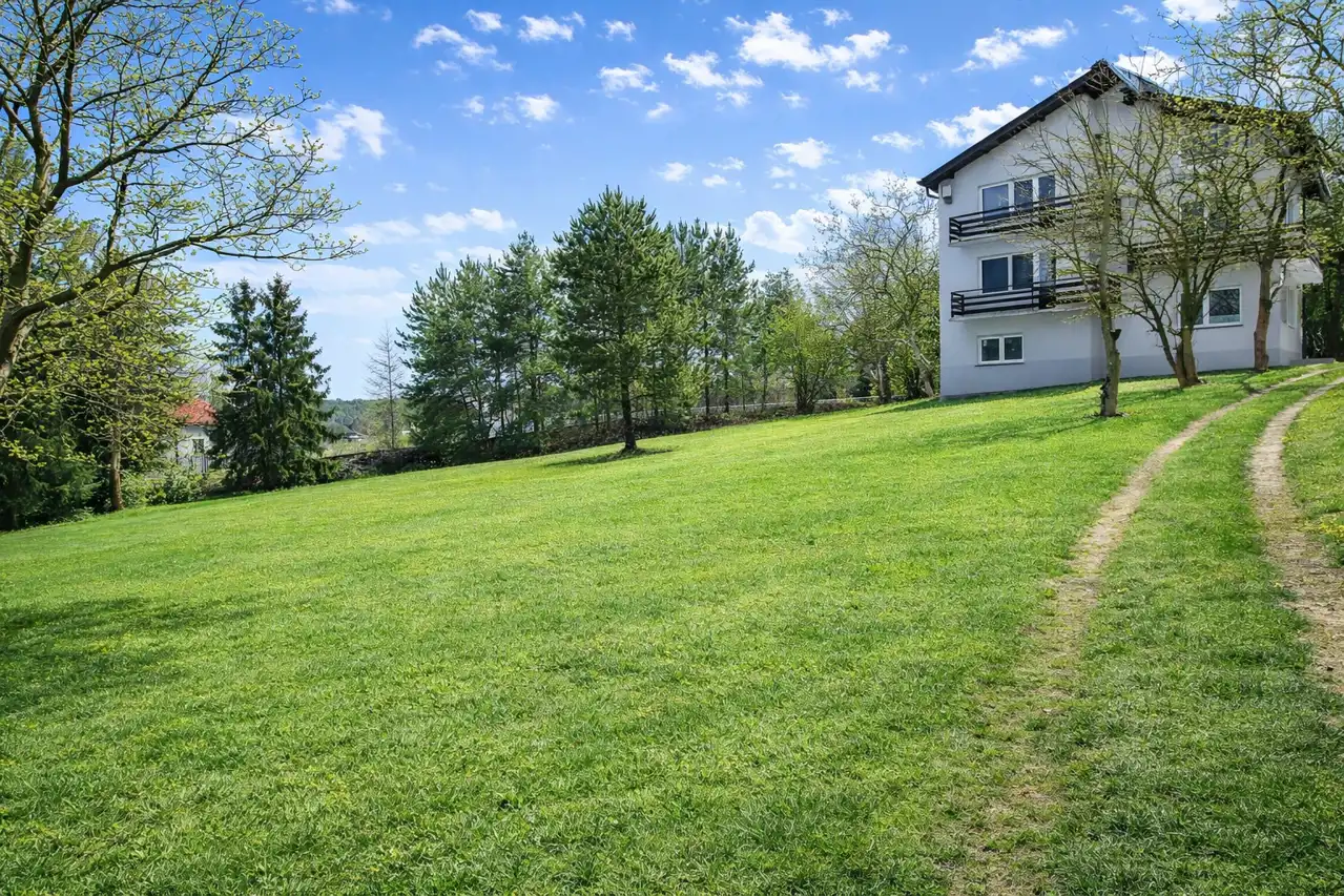 Do sprzedania działka budowlana o pow. 51,73 ara w miejscowości Brzoskwinia gm. Zabierzów. Działka lekko nachylona, w kształcie prostokąta, o wym.: 65m/73m/73m/75m. Nieruchomość położona w cichej i spokojnej okolicy. Działka znajduje przy drodze gminnej asfaltowej. Nieruchomość oznaczona w MPZP jako "9MN" - tereny zabudowy mieszkaniowej jednorodzinnej. Na działce znajduje się dom jednorodzinny o pow. całkowitej 209,4m2 (w tym piwnica o pow. 38,4m2), pow. użytkowej 171m2 + strych pow. około 50m2 do adaptacji oraz budynek gospodarczy o pow. 80m2. Dom wyremontowany w 2019r.