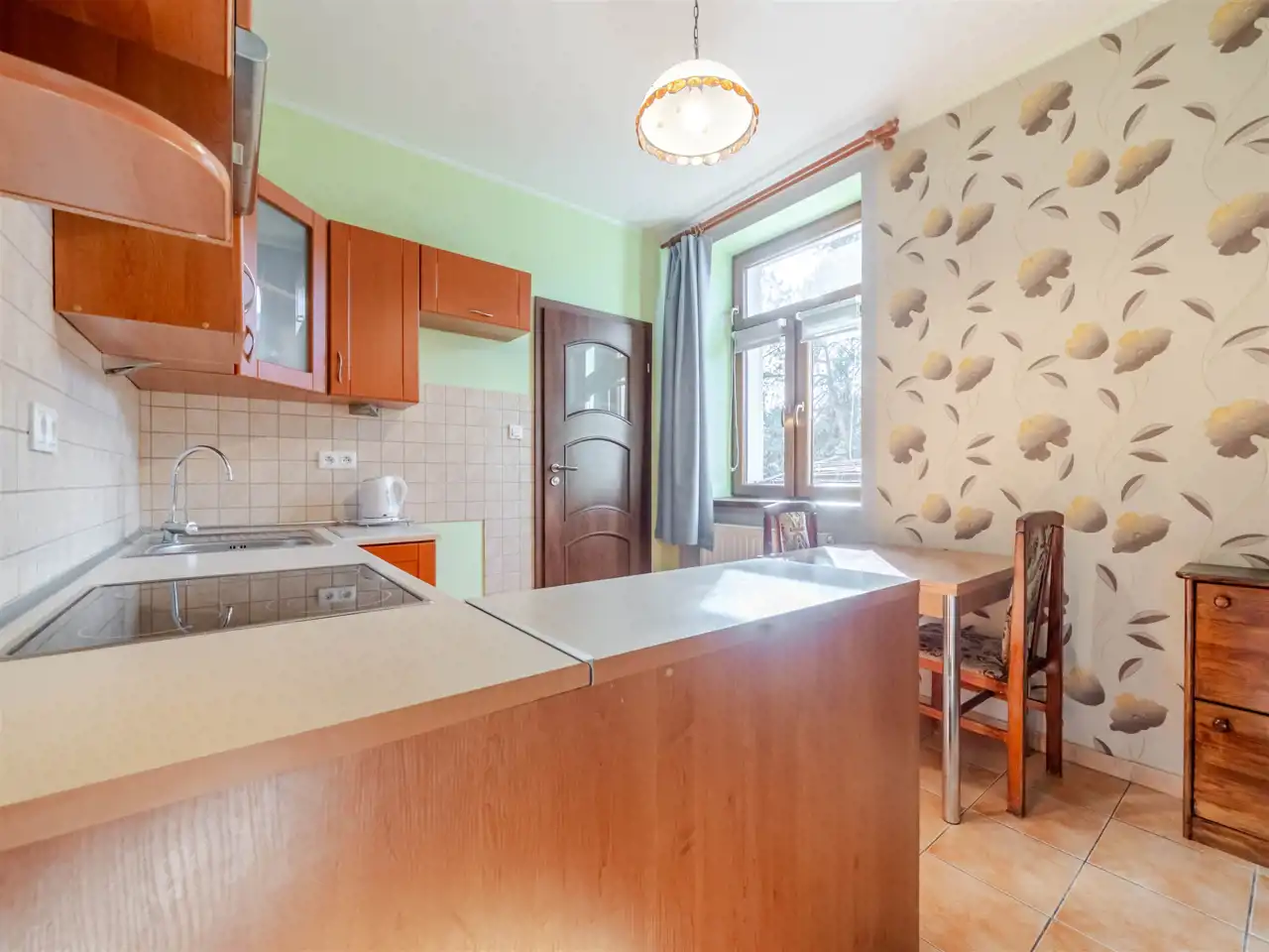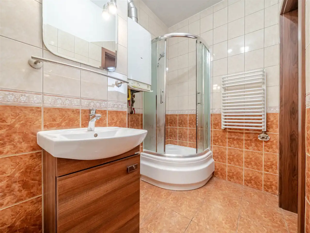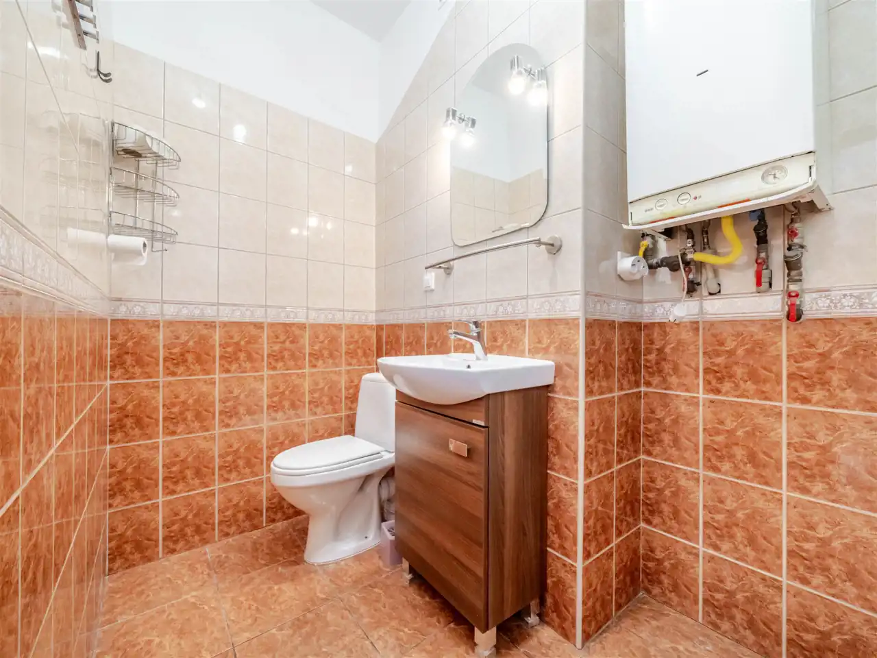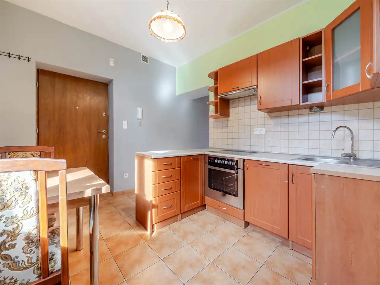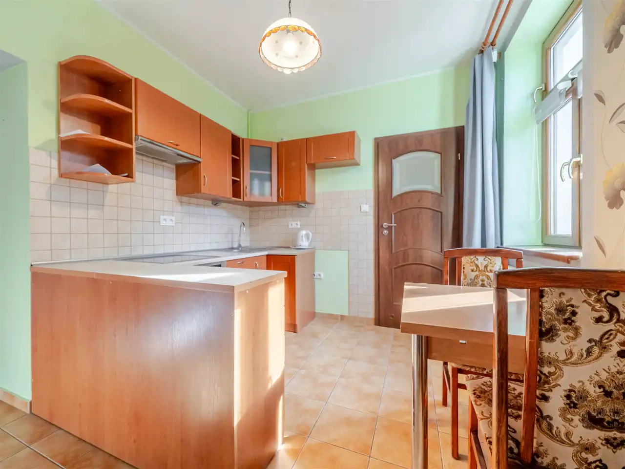 Kuchnia jest wyposażona (również w zmywarkę) i umeblowana, w łazience znajduje się kabina prysznicowa, umywalka, WC oraz piec dwufunkcyjny. Mieszkanie jest bardzo ciepłe. W przedpokoju znajduje się sporej wielkości szafa.