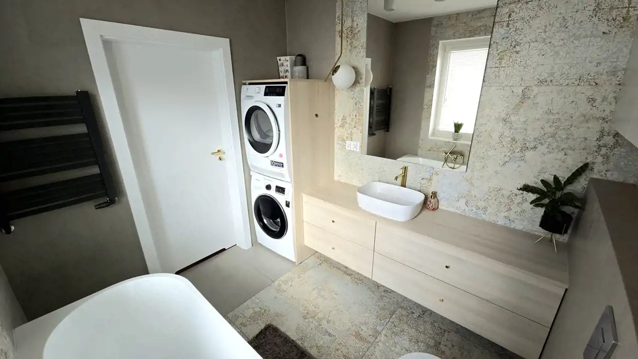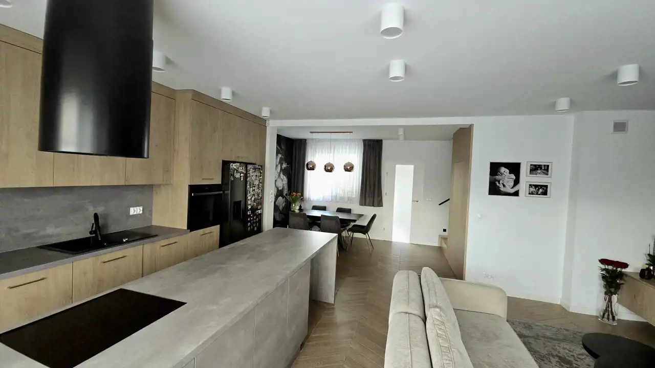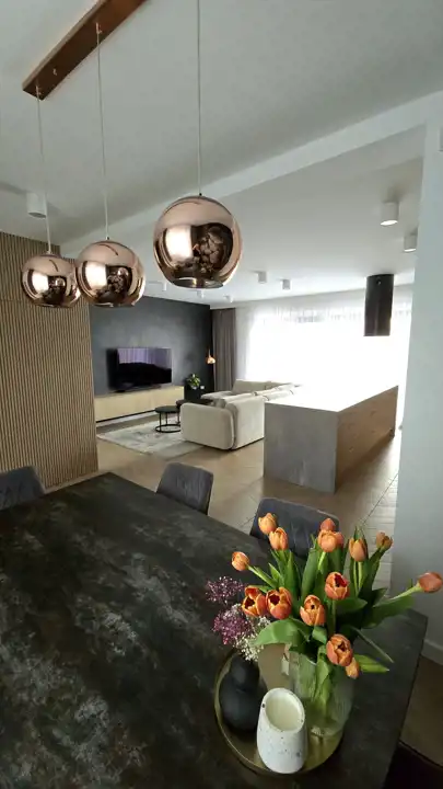Kuchnia została zaprojektowana z dbałością o każdy detal – meble na wymiar, wysokiej klasy blaty, starannie dobrane fronty i w pełni wyposażony sprzęt AGD. To miejsce, w którym gotowanie staje się prawdziwą przyjemnością i estetycznym doświadczeniem.