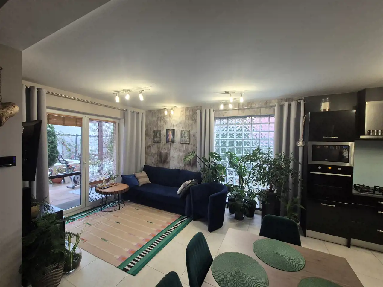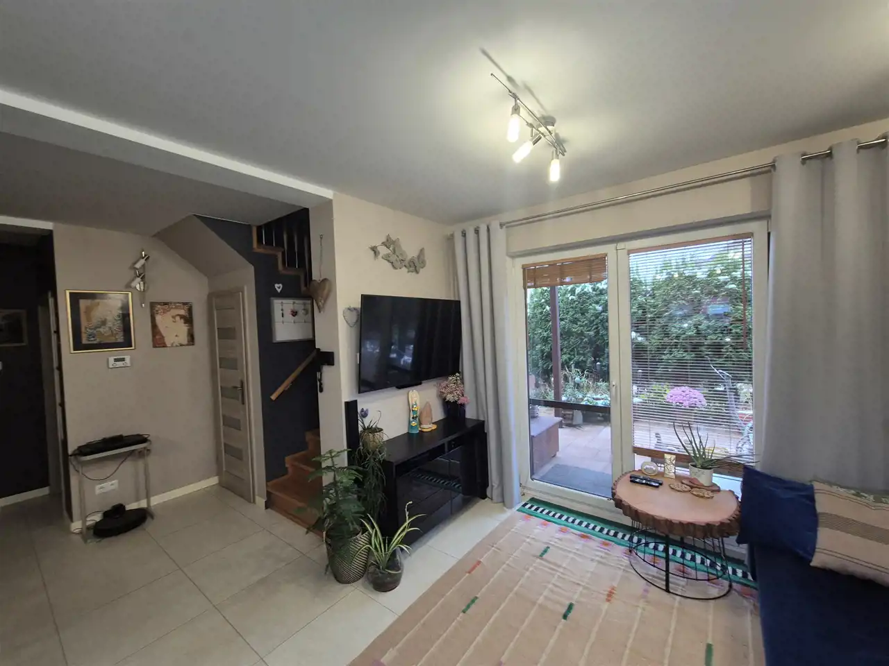 wyjście z salonu na zadaszony taras z widokiem na ogród.