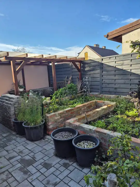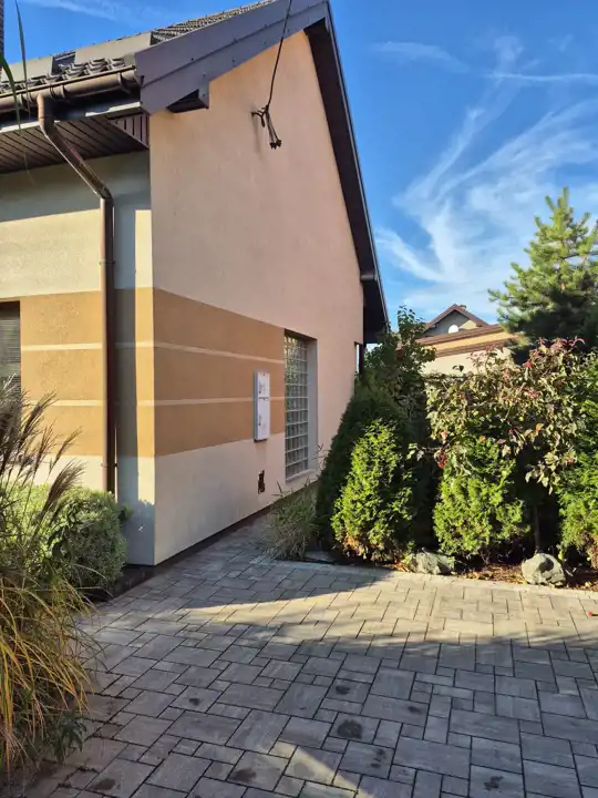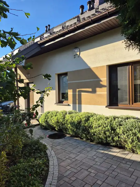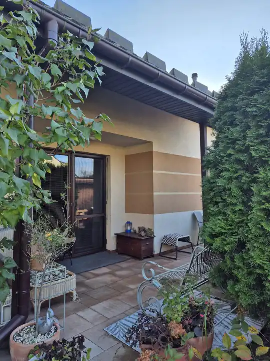 Dom prezentuje się estetycznie i nowocześnie – elewacja w stonowanych kolorach, podkreślająca zadbany charakter nieruchomości. Działka estetycznie zagospodarowana – posadzona bujna roślinnością ozdobną, przygotowane grządki do uprawy warzyw lub ziół, przygotowana instalacja rur do automatycznego nawadniania. W bieżącym roku wykonano nową, wysokiej jakości kostkę brukową wokół domu. Na terenie posesji znajdują się: