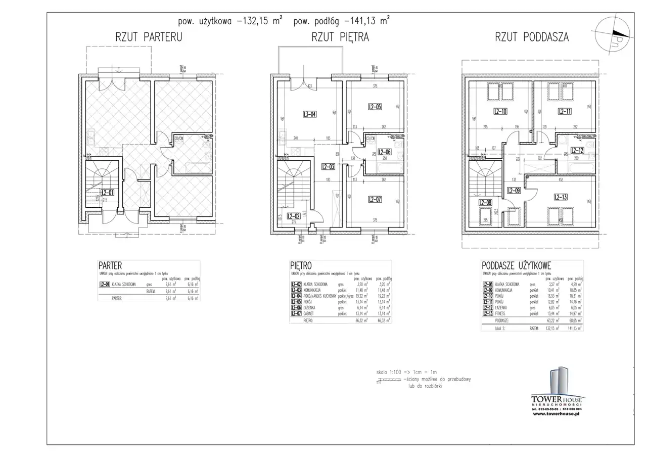 Poddasze (63 m2) - trzy pokoje (17 m2, 13 m2 ,13 m2),łazienka (6 m2) ,Komunikacja (10 m2) ,klatka schodowa ( 3.5 m2)