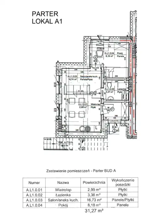 - Charakterystyka mieszkania 31.27 m2, 2 pokoje