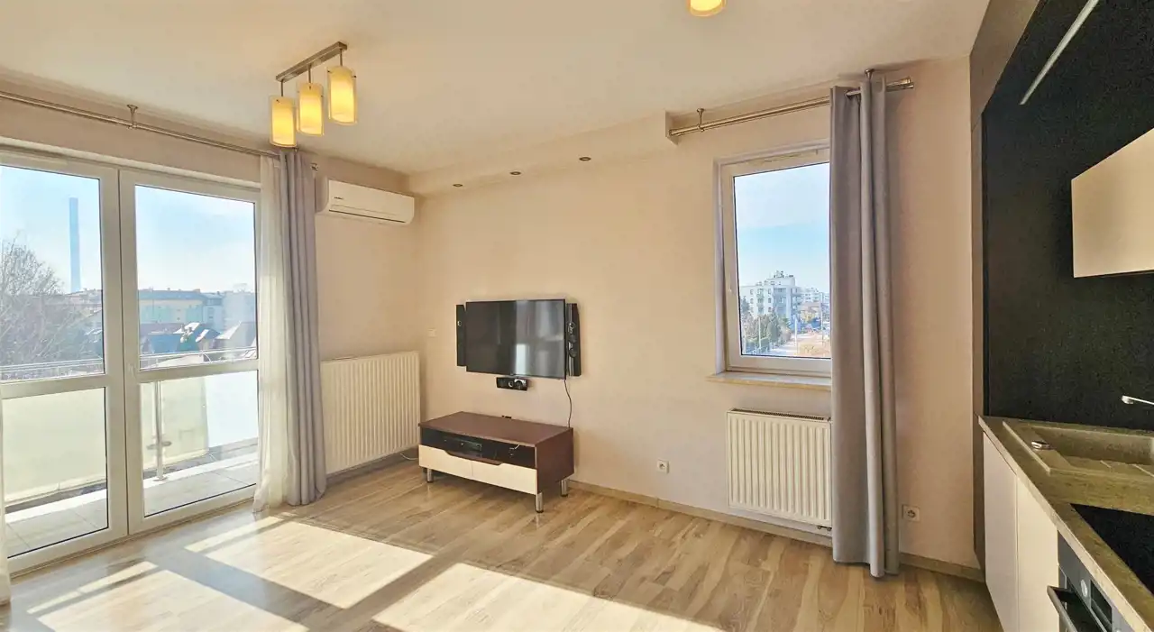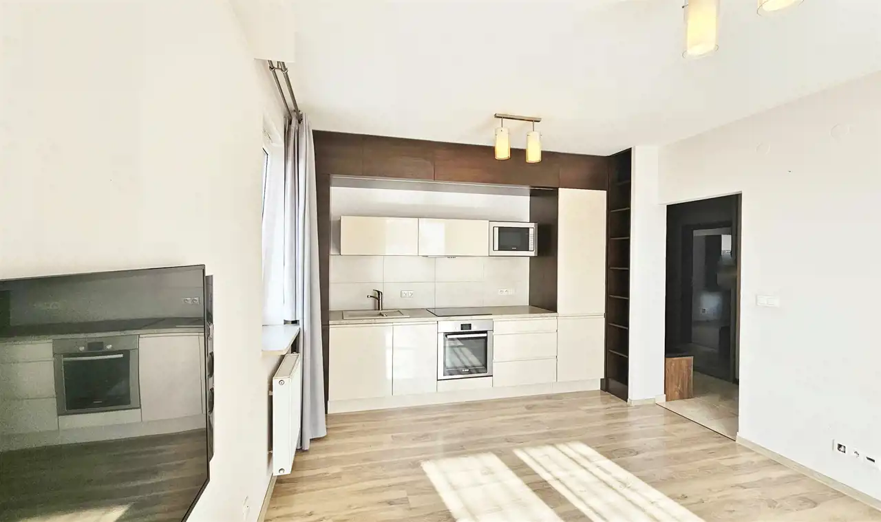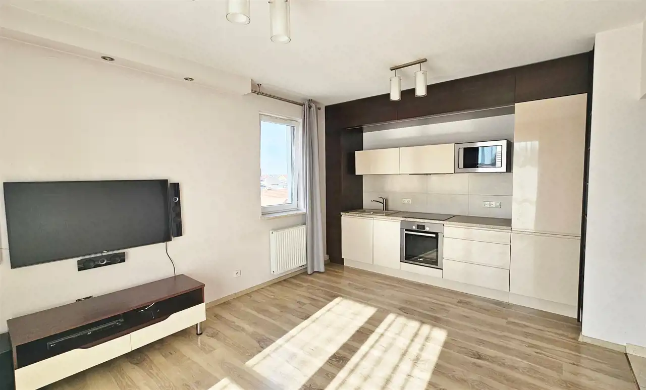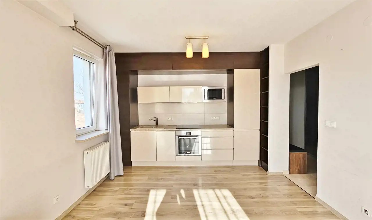 - Pokój dzienny z ładnym aneksem kuchennym ( w cenie pozostaje: zabudowa kuchenna na wymiar ze sprzętem AGD zmywarka, lodówka, płyta indukcyjna+ piekarnik, pochłaniacz powietrza), w salonie założona jest klimatyzacja