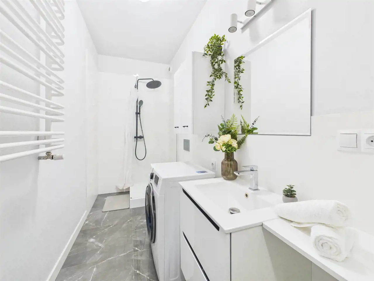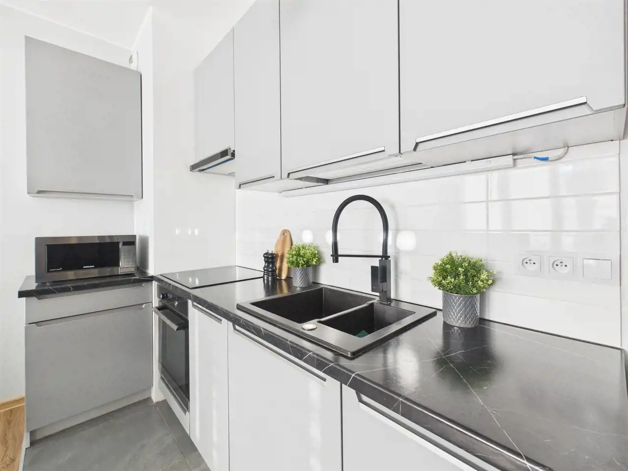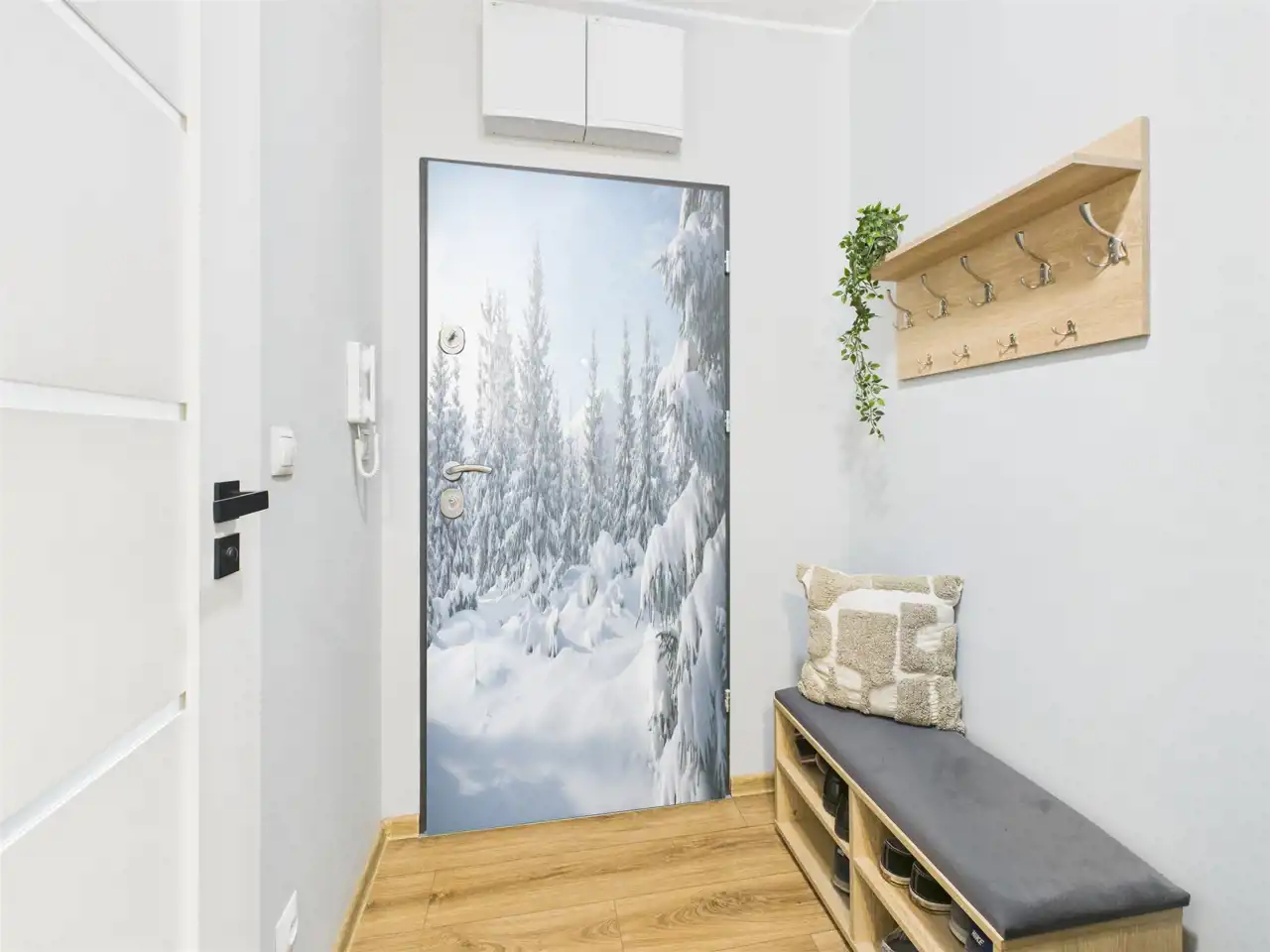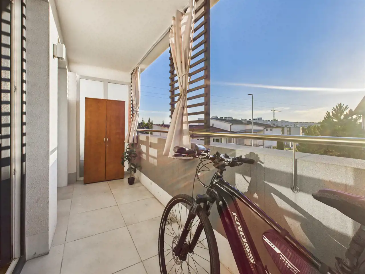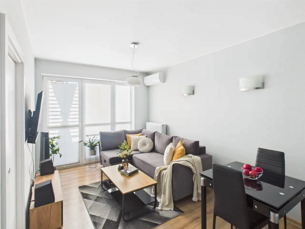Do mieszkania przynależy balkon o powierzchni 6,86 m². Lokal jest w pełni wyposażony, gotowy do wprowadzenia, a dodatkowym atutem jest klimatyzacja z funkcją grzania.