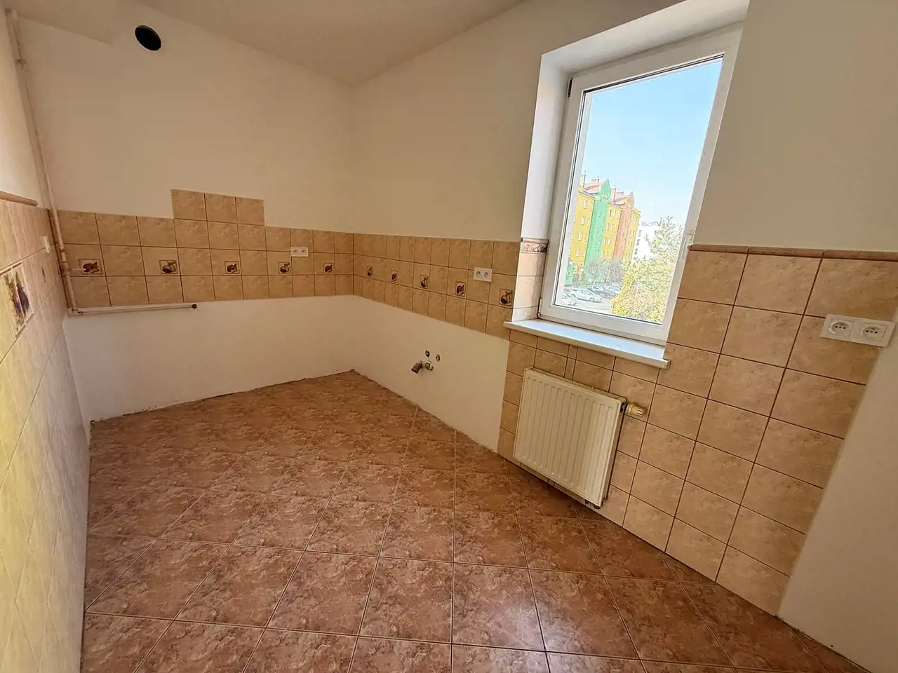 W łazience jest miejsce na zamontowanie pieca gazowego dwufunkcyjnego, który ogrzewa mieszkanie i podgrzewa ciepłą wodę.