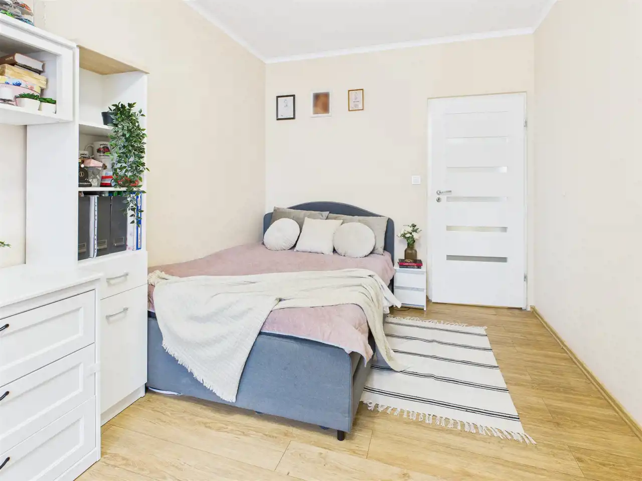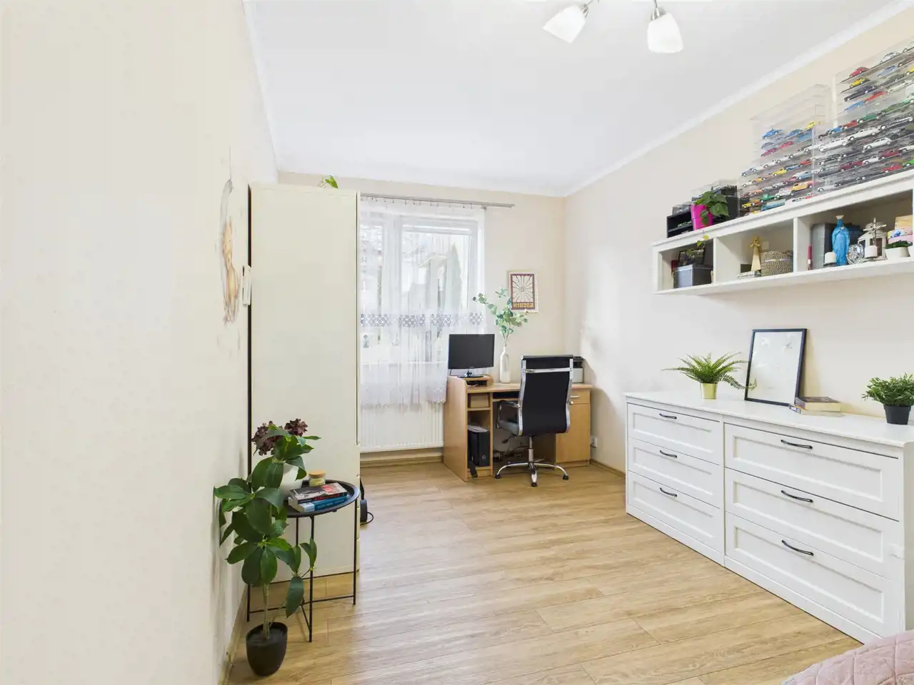 Ustawna sypialnia z łatwością pomieści duże łóżko i pojemną szafę, a dodatkowo pozostawia także miejsce na wygodny kącik do pracy – biurko i regał, idealne do pracy zdalnej.