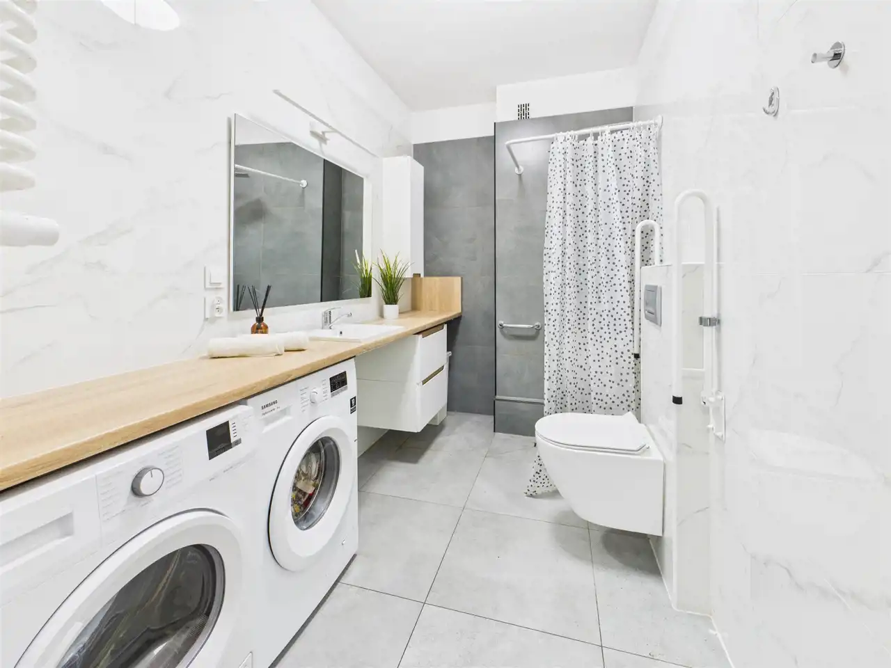 Funkcjonalna łazienka z prysznicem posiada zabudowę do przechowywania kosmetyków i akcesoriów oraz łatwo dostępne miejsce na pralkę i suszarkę.