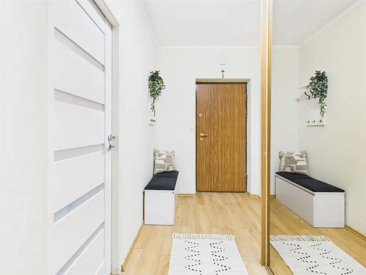 W holu znajduje się duża, pojemna, zabudowana szafa (od podłogi do sufitu) z lustrzanymi drzwiami przesuwnymi, która zapewnia możliwość magazynowania ubrań, sprzętów domowych, narzędzi, pościeli lub butów.