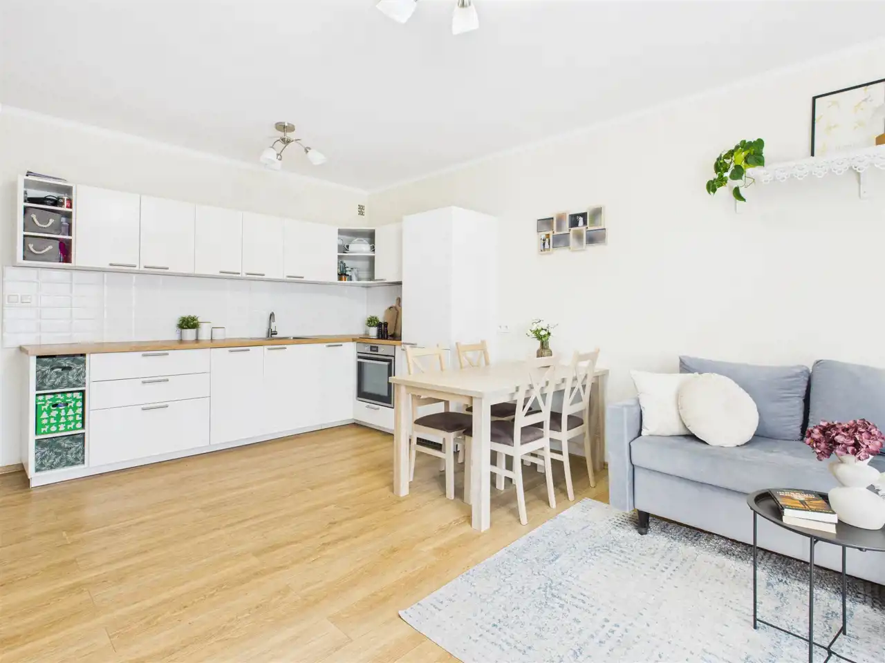 Kuchnia w zabudowie wyposażona jest w sprzęty AGD (lodówkę, piekarnik, płytę indukcyjną oraz zmywarkę), połączona z salonem zapewnia wygodę korzystania z obu przestrzeni.