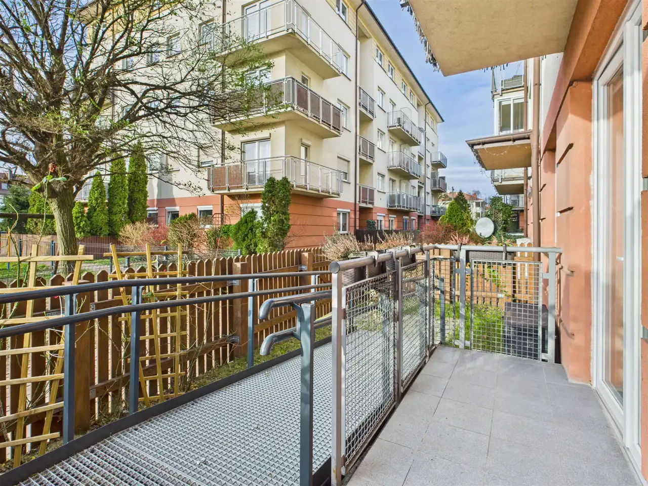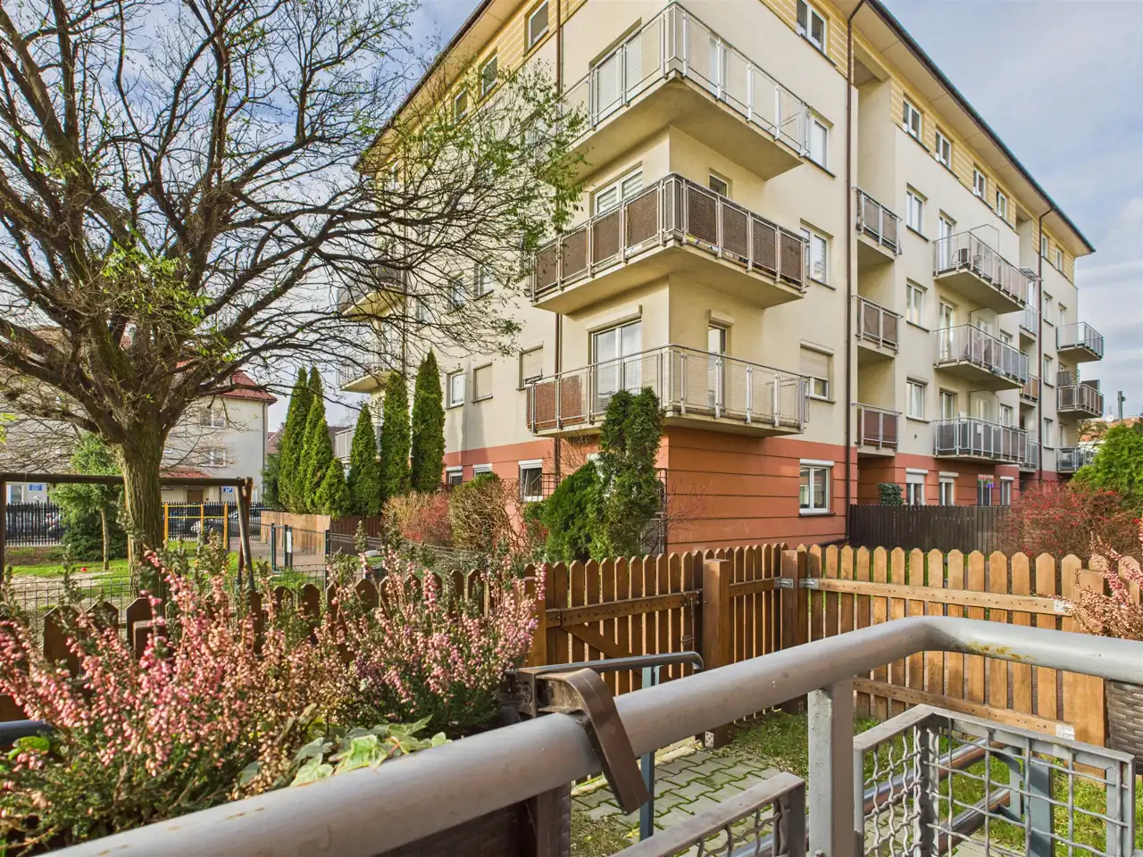 Do mieszkania przynależy balkon ok. 4,6 m2 oraz ogródek ok. 15 m2. Dodatkowym atutem jest furtka w ogrodzeniu ogródka, która umożliwia wejście na jego teren bezpośrednio z osiedlowego chodnika. Przy balkonie zamontowano rampę (możliwość demontażu) co dodatkowo umożliwia wejście do mieszkania bez korzystania z klatki schodowej – świetne dla dzieci (wózki, rowery), czy osób starszych.
