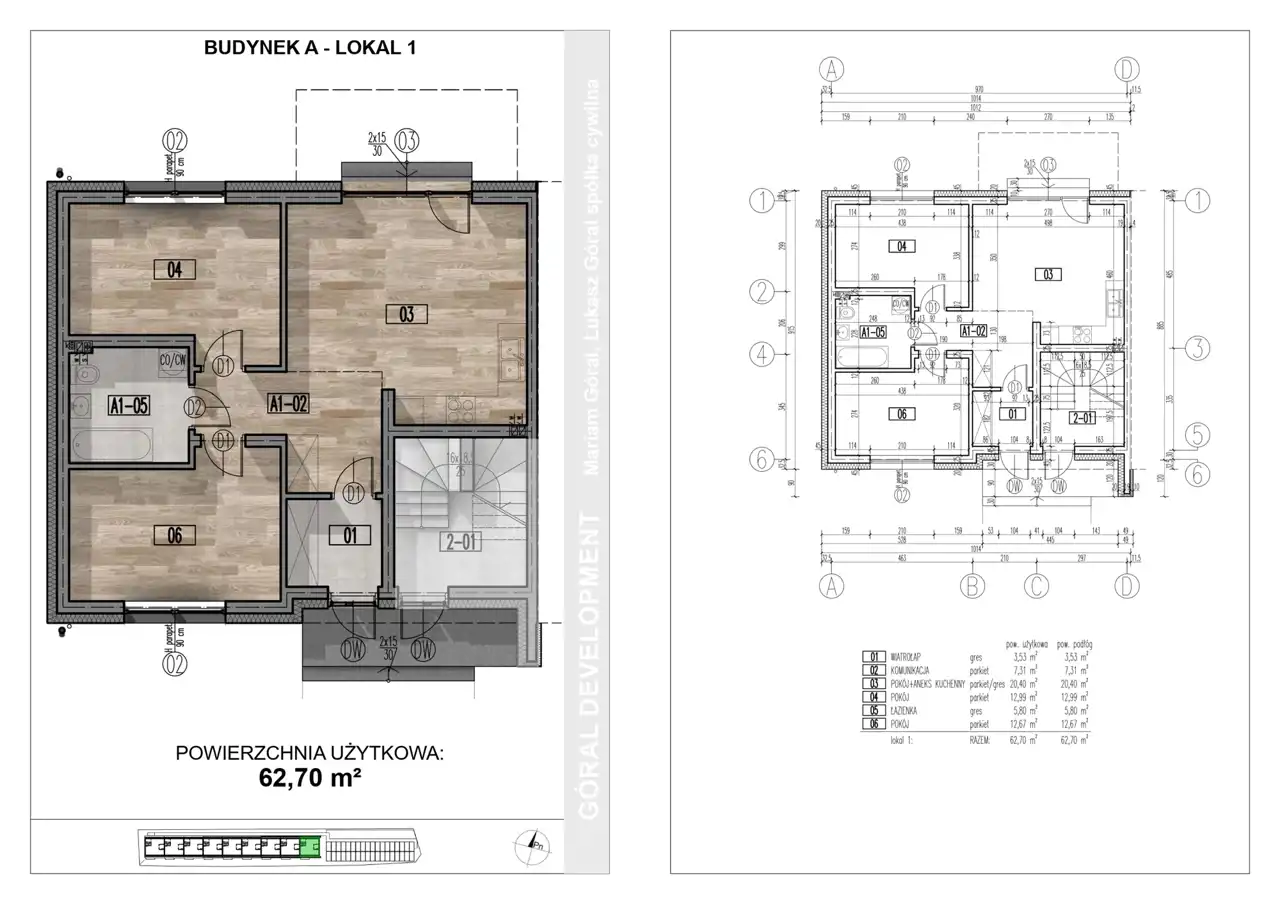 Lokal dolny (62,70 m²): wiatrołap, dwa pokoje, salon z aneksem kuchennym, łazienka