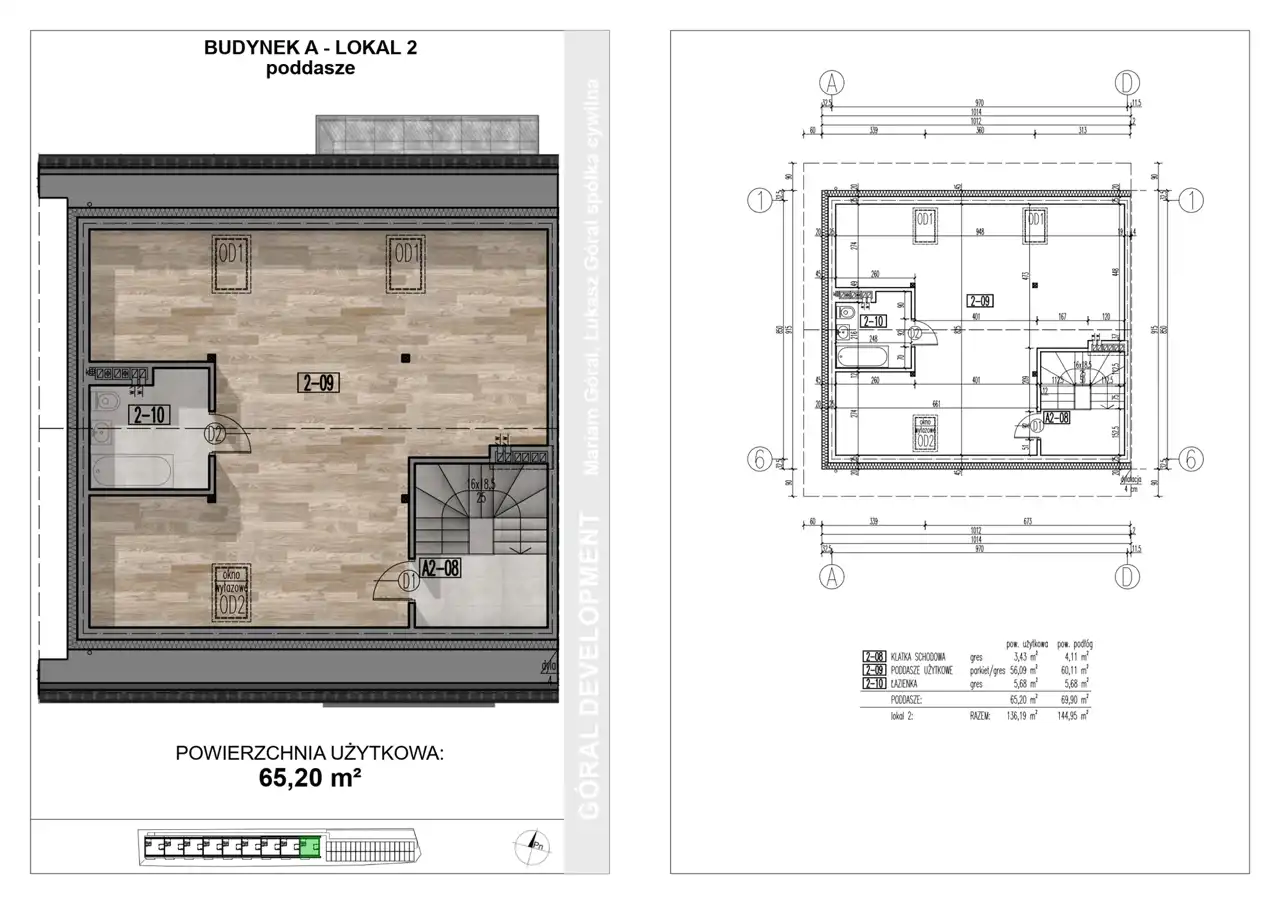 Lokal górny (136,19 m²): parter: klatka schodowa, piętro: dwa pokoje, komunikacja, łazienka, salon z aneksem kuchennym, poddasze: łazienka oraz przestrzeń do własnej aranżacji.