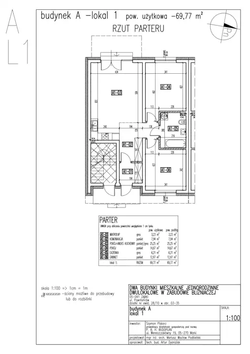 - Powierzchnia użytkowa 69,77 m² – wiatrołap, komunikacja, salon z aneksem kuchennym, sypialnia, łazienka, gabinet.