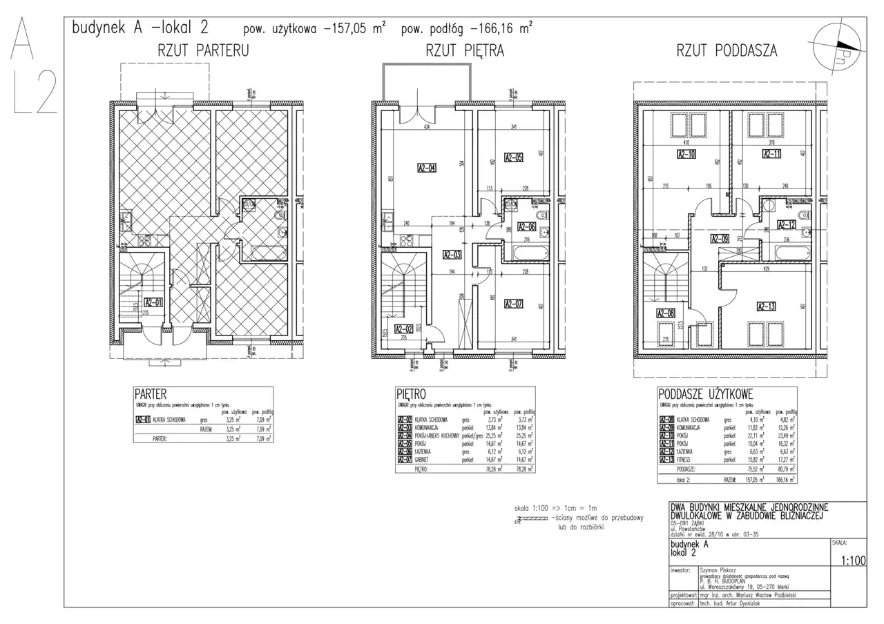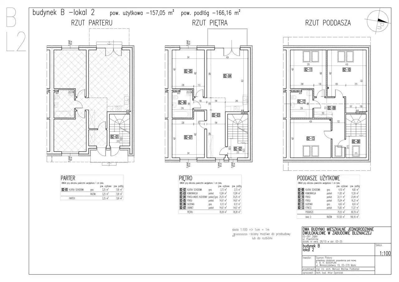 - Poddasze: klatka schodowa, komunikacja, dwa pokoje, łazienka oraz pomieszczenie fitness
