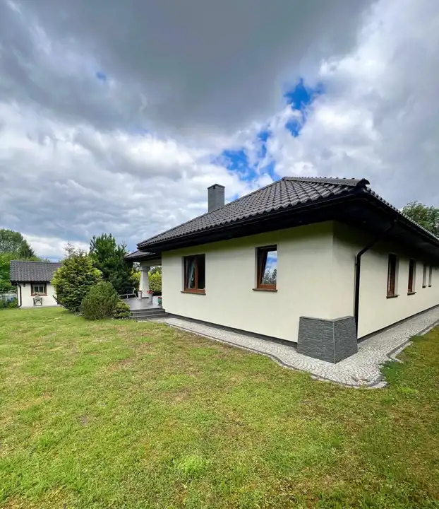 Dom o powierzchni 154 m2, posadowiony jest na działce 16 ar. Zarówno do budowy jak i wnętrza domu zastosowano najwyższej jakości materiały (sprowadzane z zagranicy specjalnie pod ten projekt) .Wykonane odpowiednie rozwiązania technologiczne odpowiedzialne są za jego energooszczędność. Charakteryzuje go funkcjonalny rozkład wnętrz, który zapewnia wygodną komunikację w domu. Nieruchomość składa się z przestronnego salonu z otwartą kuchnią z wyjściem na taras, sypialni z prywatną łazienką, pokoju gościnnego z łazienką, sypialni dla gości, łazienki ogólnodostępnej, pomieszczenia gospodarczego z dodatkową kuchnią oraz pralnią. Wnętrze zostało zaprojektowane przez wysokiej rangi projektantów.