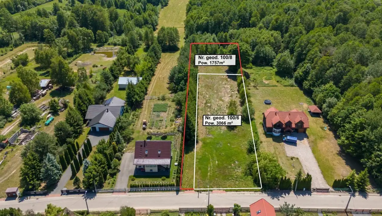 Działka ma kształt prostokąta o wymiarach 30 x 165 m i łączną powierzchnię wynoszącą 4823m2. Składa się z dwóch mniejszych działek o numerach geodezyjnych 100/6 (3066 m2) oraz 100/8 (1757 m2). Obie z dostępem do drogi gminnej oraz warunkami zabudowy na budowę wolnostojącego budynku mieszkalnego w zabudowie jednorodzinnej wraz z infrastrukturą techniczną. Klasa gruntu RV i RVI.