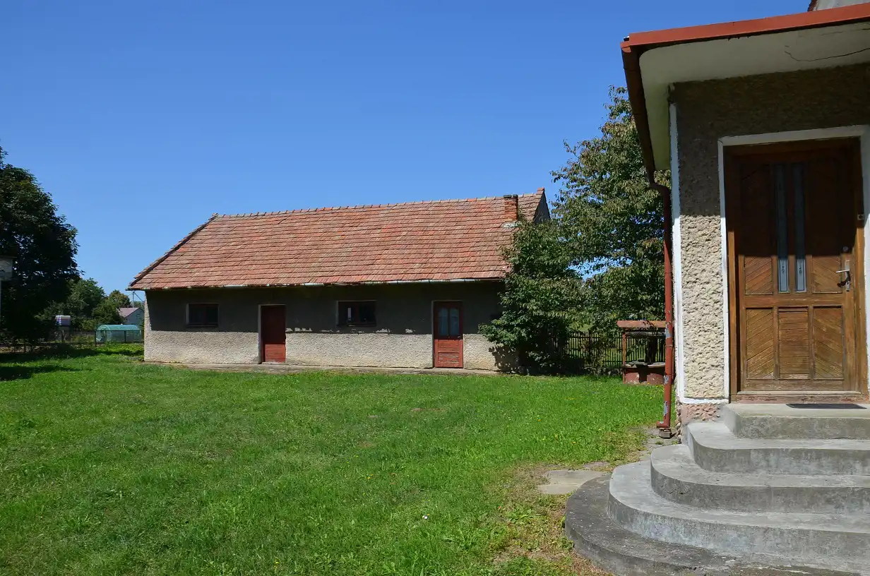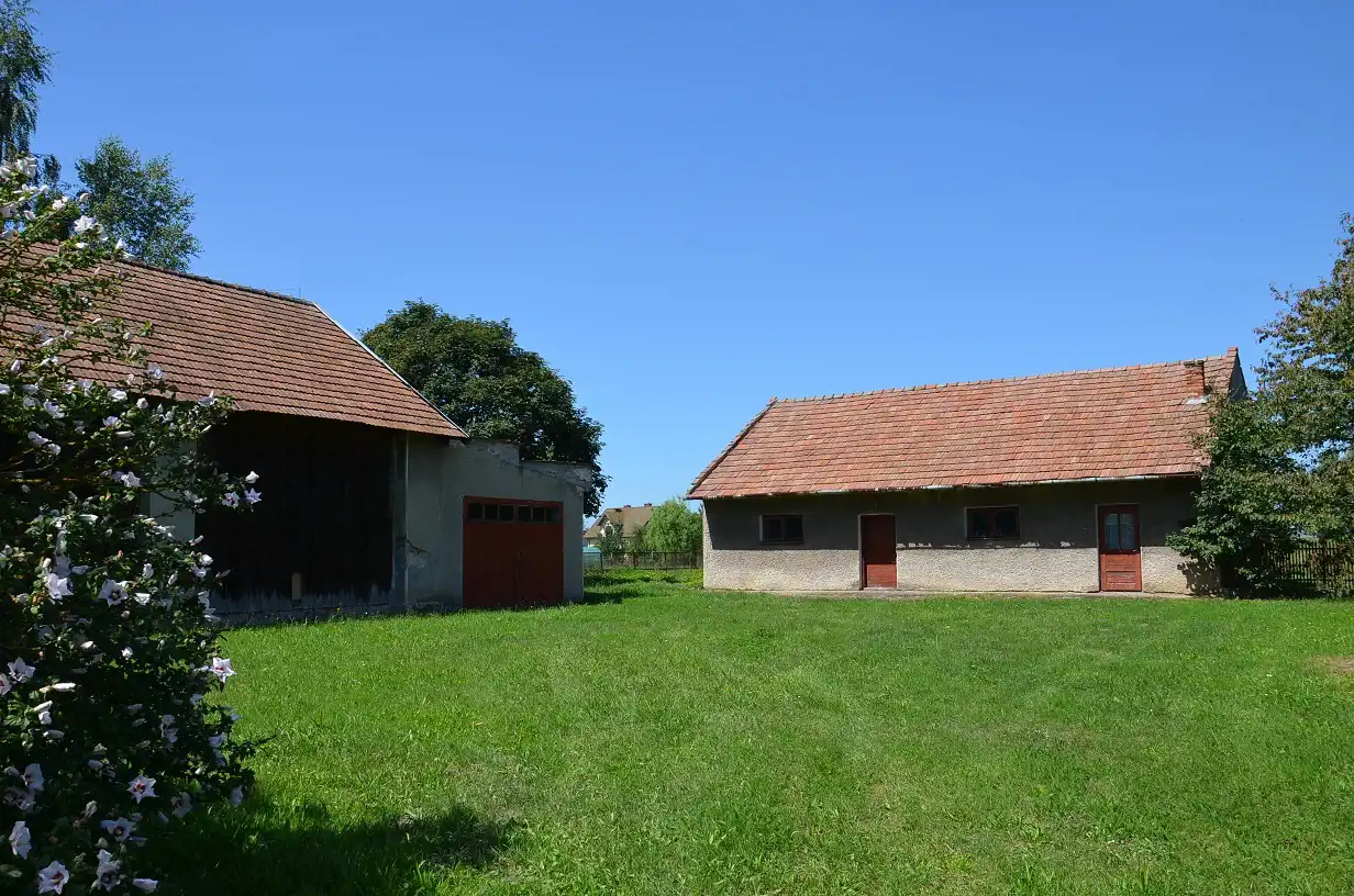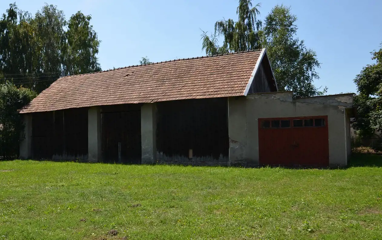 - stodoła drewniano-murowana z lat 50-tych, kryta dachówką o powierzchni ok.160m2, z dobudowanym garażem.