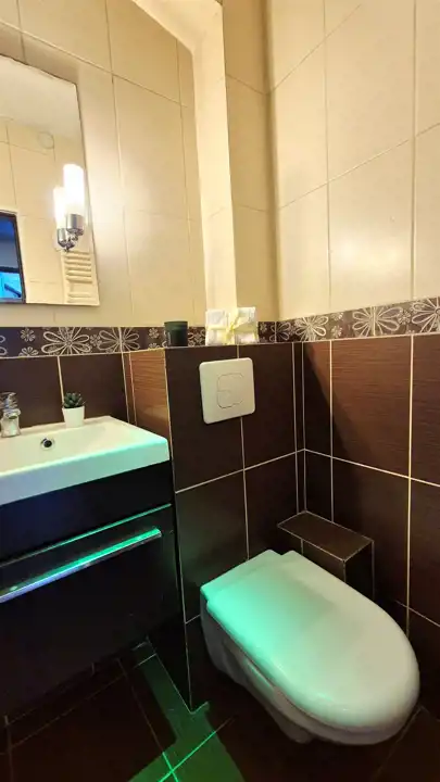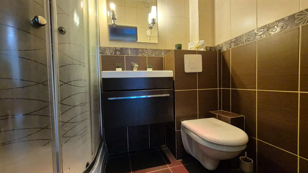 - łazienka z kabiną prysznicową, umywalką i toaletą