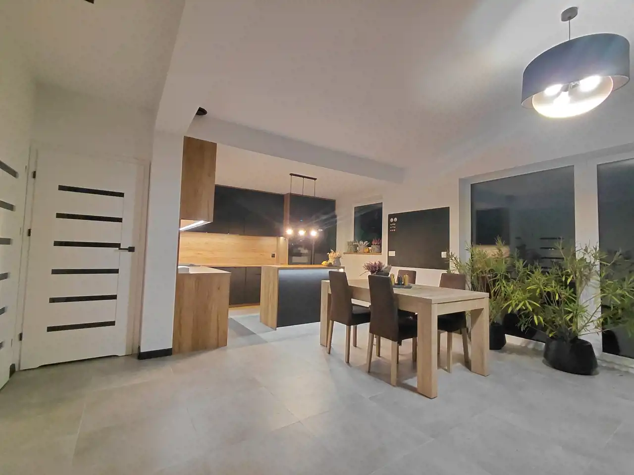 Przestronny salon z aneksem kuchennym i wyjściem bezpośrednio do ogrodu – idealny do relaksu i spotkań z bliskimi.