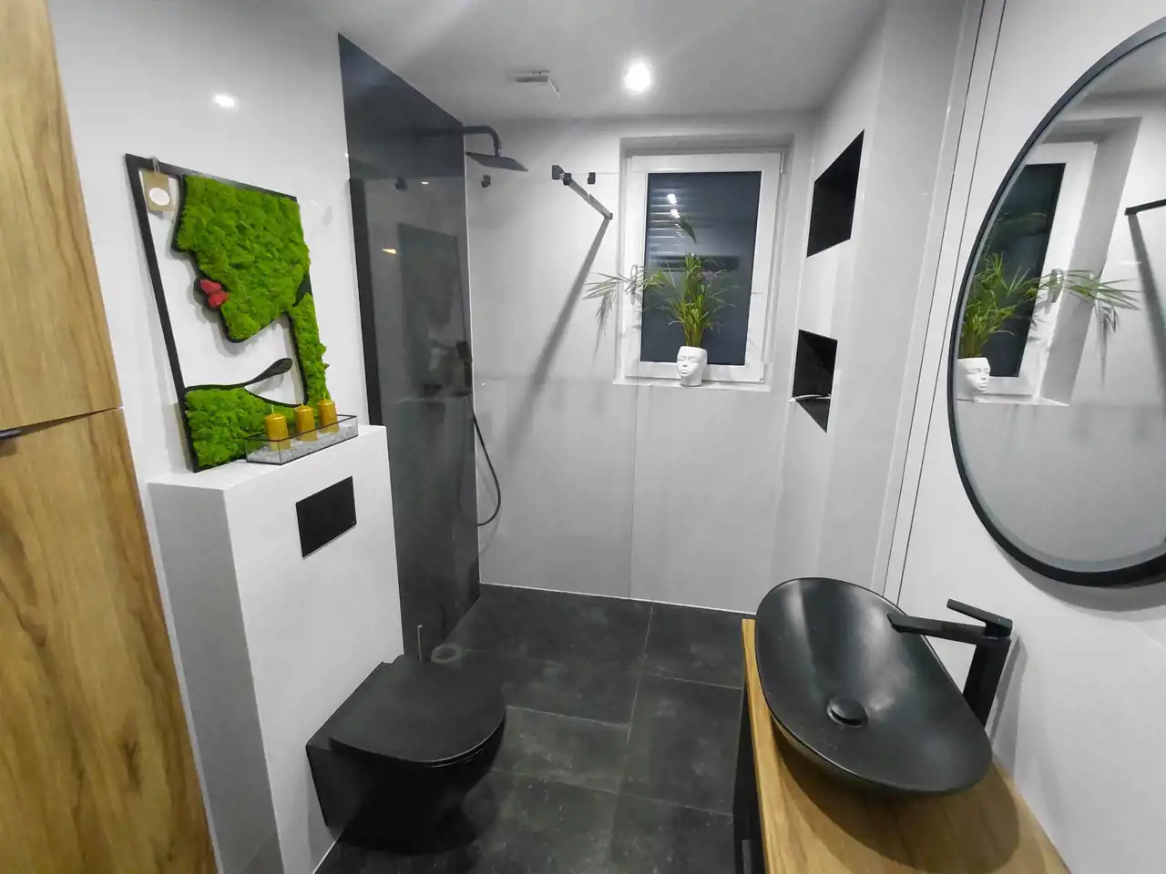 Łazienka z WC wyposażona w prysznic z odpływem liniowym, oświetlenie LED oraz meble na wymiar.