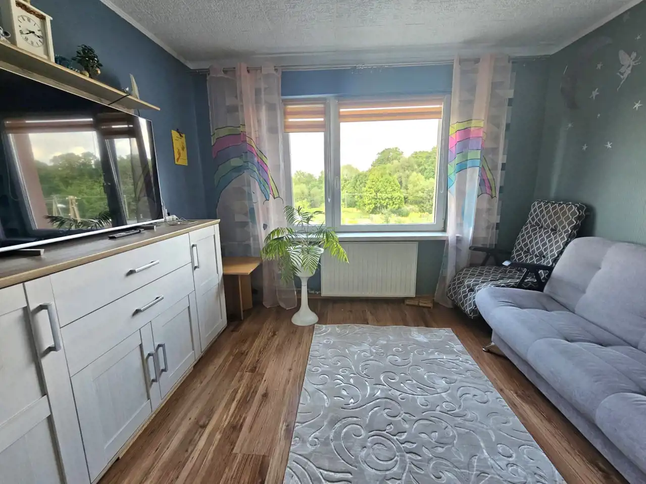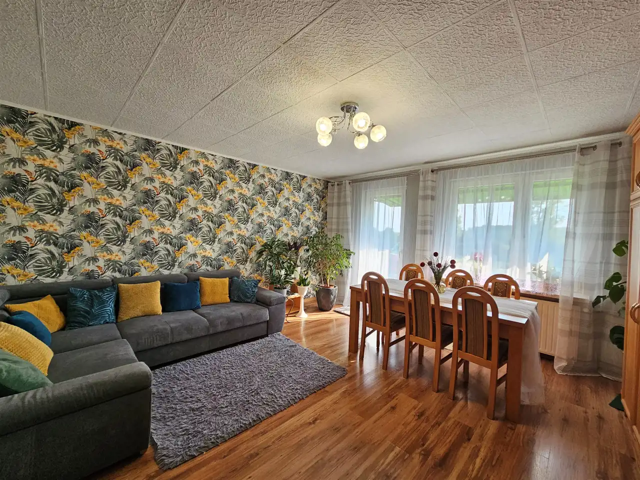 Mieszkanie składa się z dużego salonu z wyjściem na balkon, z którego rozciąga się piękny widok na pola i zachody słońca. w salonie znajduje się dwuletni narożnik w idealnym stanie, segment starego typu, ale zadbany, a także stół z krzesłami.