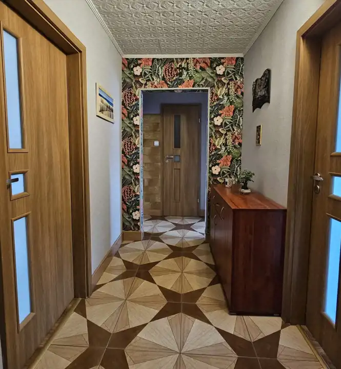 Na podłogach panele i terakota, na ścianach nowe tapety o ciekawych wzorach, a na suficie pomalowane kasetony.