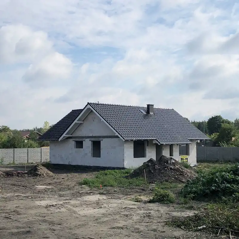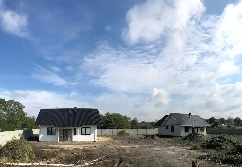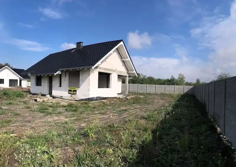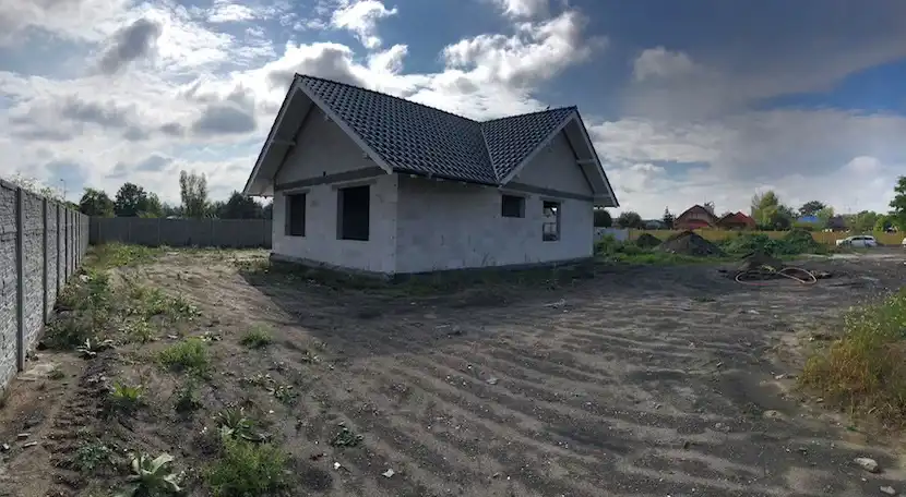 ściany - suporex, dach-dachówka ceramiczna ROBEN, okna-plastikowe (profile Veki), instalacje wodno-kanalizacyjne, elektryczna, instalacja gazowa z piecem (DeDietrich lub Immergas - ogrzewanie podłogowe, posadzki betonowe, tynki maszynowe, rygipsy, ocieplenie dachu wełną, elewacja zewnętrzna (ocieplenie styropianem 15cm + putz sylikonowo-sylikatowy), ciąg komunikacyjny - chodniki (kostka betonowa), ogrodzenie z trzech stron bez frontowego - betonowe z panelami ocynkowanymi powlekane na zielono).