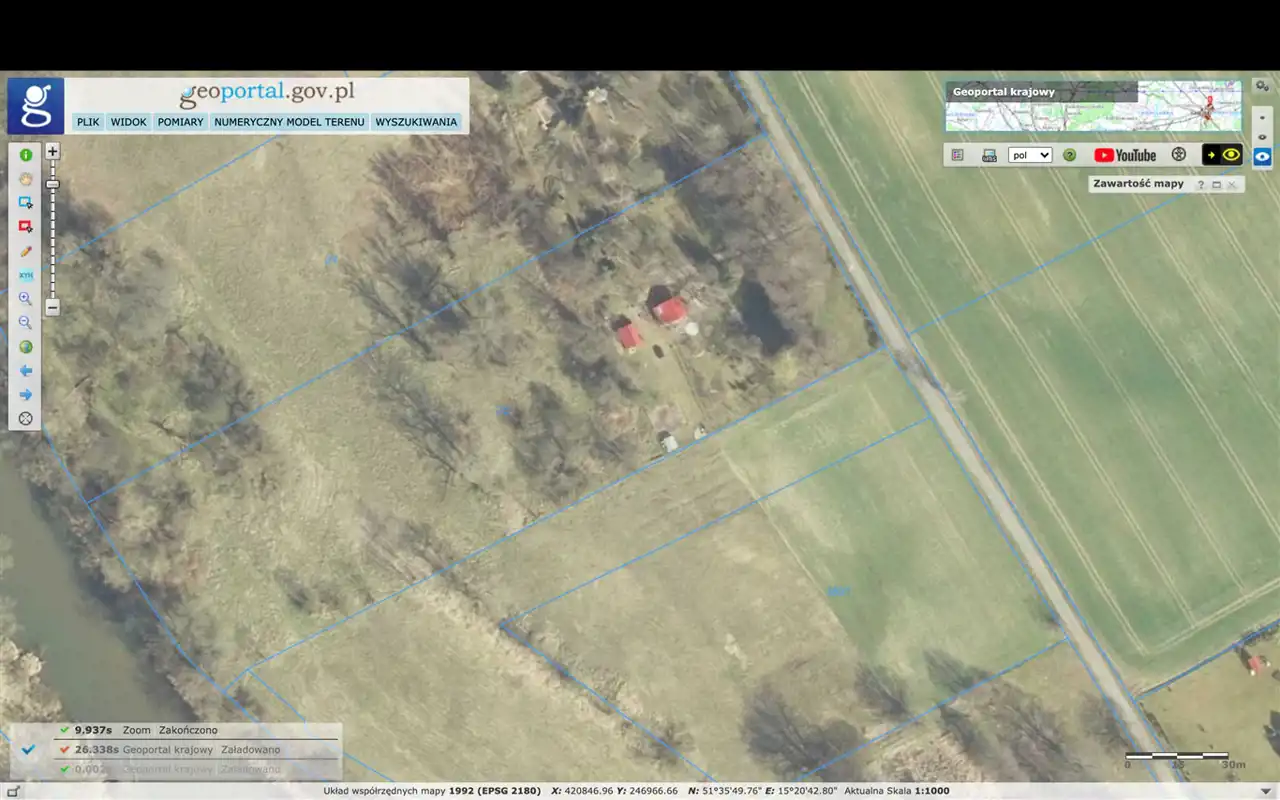 - Działka częściowo zagospodarowana, lekko nachylona, prostokąt