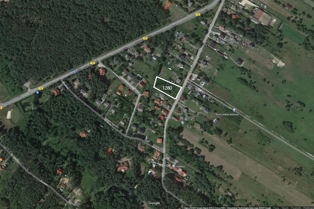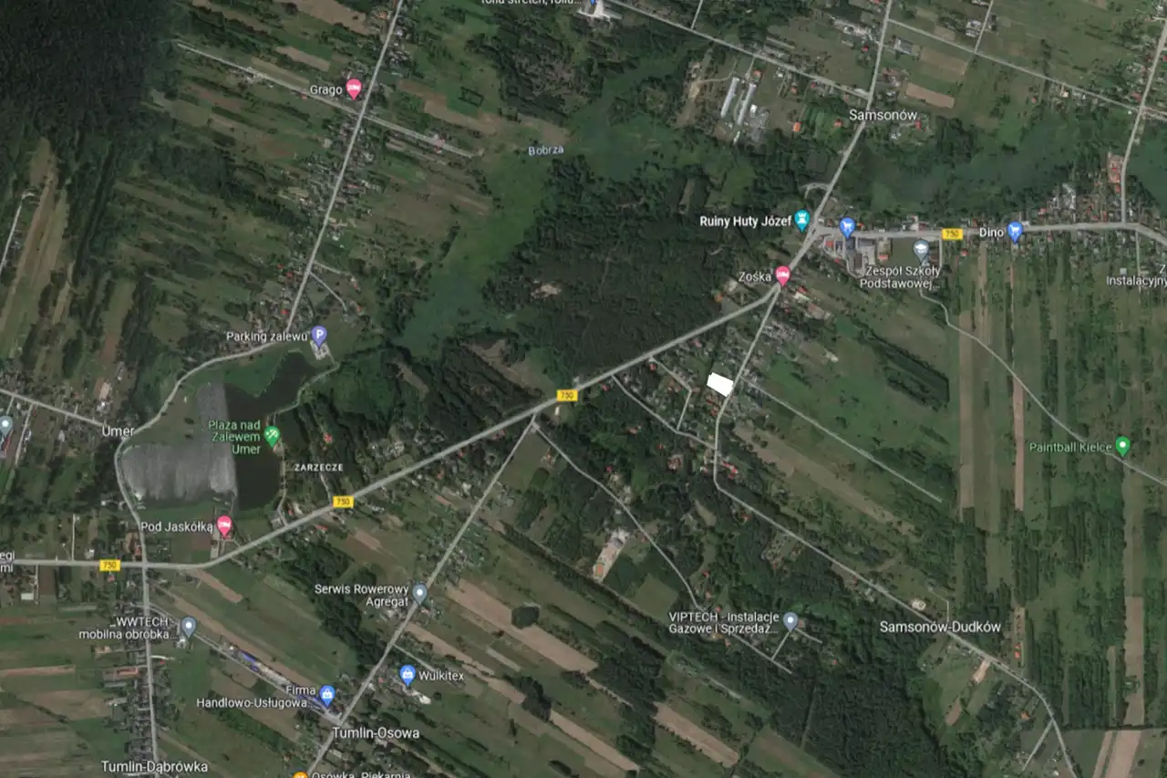 For sale: Plot of land with an area of 2200 sqm, located in the town of Samsonów-Komorniki, Zagnańsk municipality. The plot is situated along an asphalt road and has a shape close to a rectangle. The land is undeveloped and unfenced.