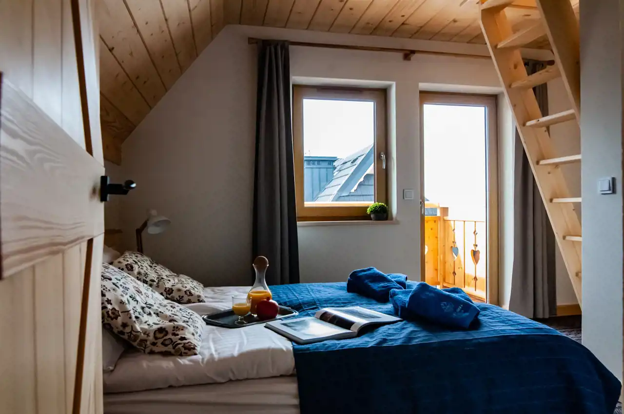 Apartament na poddaszu składa się z: salonu z aneksem kuchennym, sypialni, dwóch antresoli zaadaptowanych na sypialnie, łazienki z wc. Do apartamentu przynależą dwa balkony.