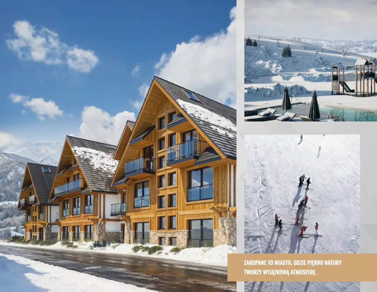 Wnętrza apartamentów charakteryzują się przestronnością, elegancją i nowoczesnym designem, który harmonijnie współgra z lokalnym charakterem regionu. Projektanci postawili na naturalne materiały – drewno, wełnę i skórę – tworzącą przytulną, ciepłą atmosferę sprzyjającą relaksowi. Uzupełnieniem aranżacji są subtelne ornamenty góralskie obecne w detalach wykończeniowych, które nadają wnętrzom wyjątkowy, regionalny charakter.
