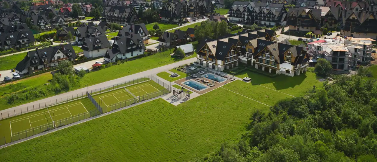 Na terenie inwestycji przewidziano również basen zewnętrzny, jacuzzi, kort tenisowy oraz plac zabaw dla dzieci – idealne uzupełnienie wypoczynku zarówno dla rodzin, jak i osób ceniących aktywność i relaks z widokiem na góry.