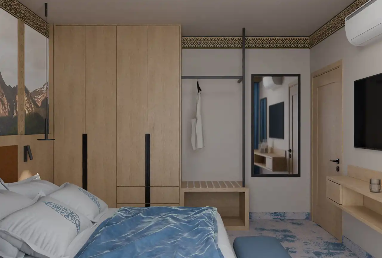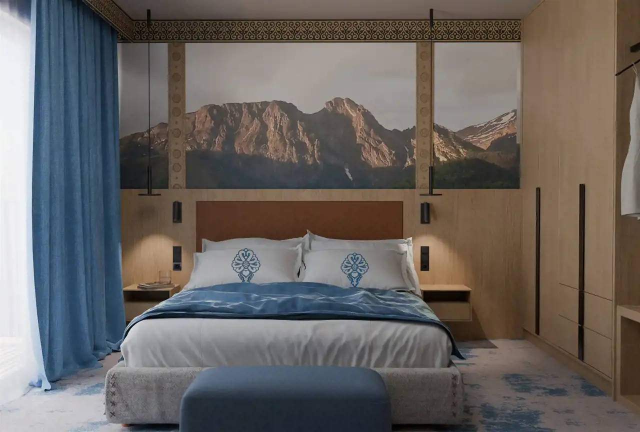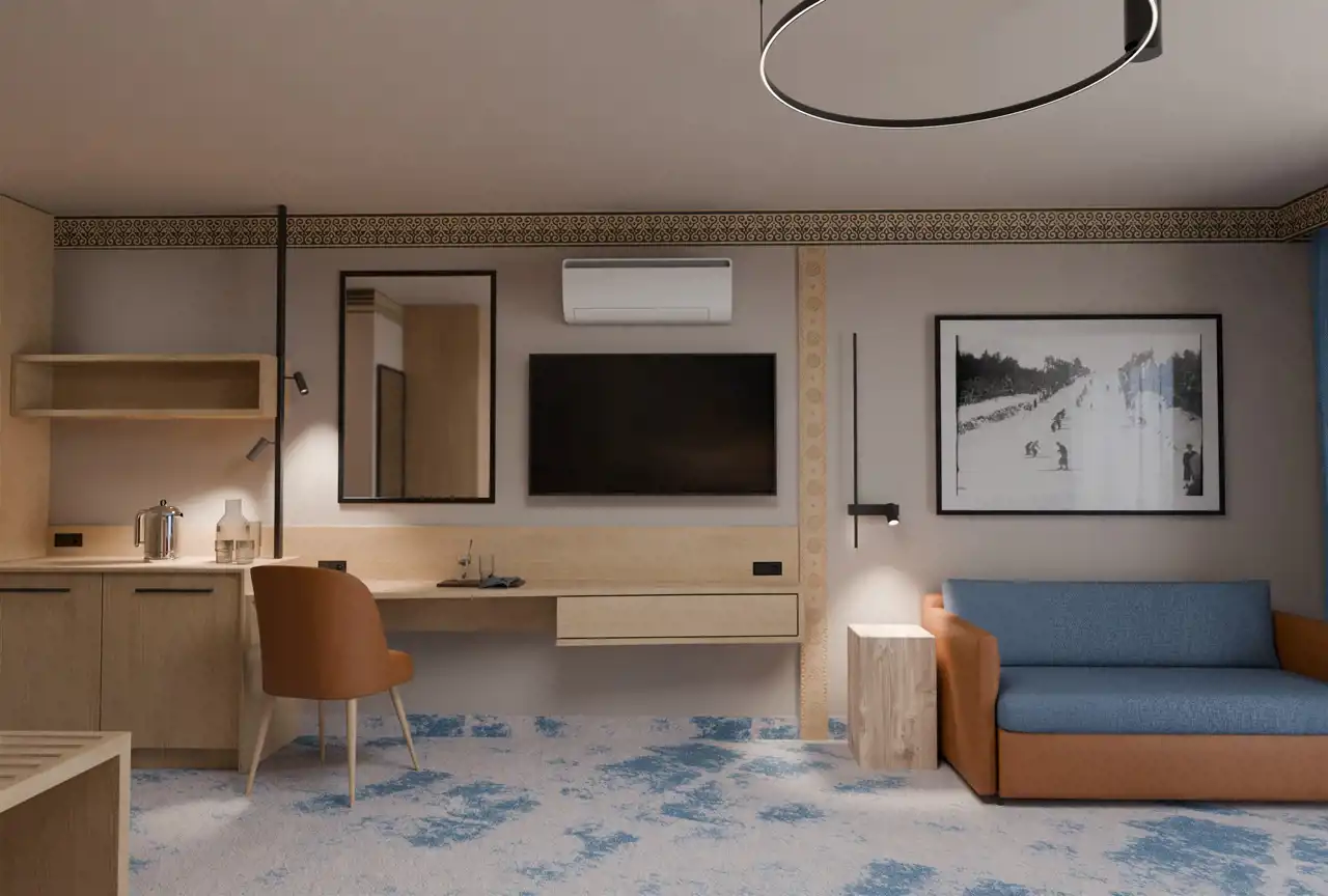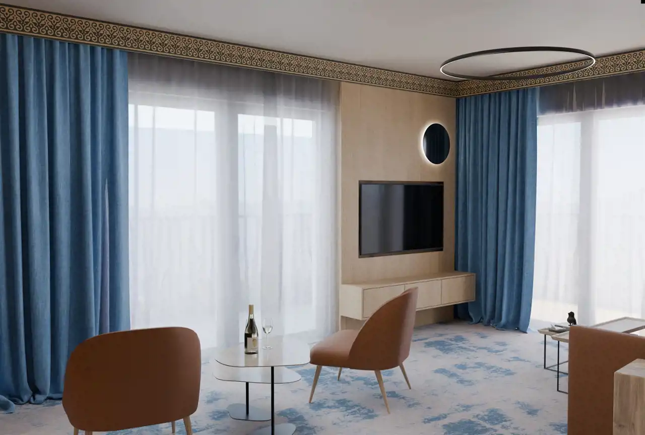 W pokojach i apartamentach nie zabrakło tradycyjnych akcentów – naturalne tkaniny, regionalne dekoracje oraz drewniane wykończenia harmonijnie współgrają z nowoczesnymi udogodnieniami, takimi jak inteligentne systemy zarządzania, klimatyzacja czy wysokiej klasy wyposażenie.