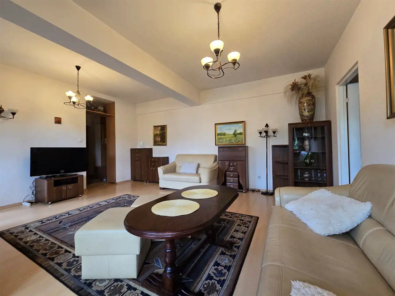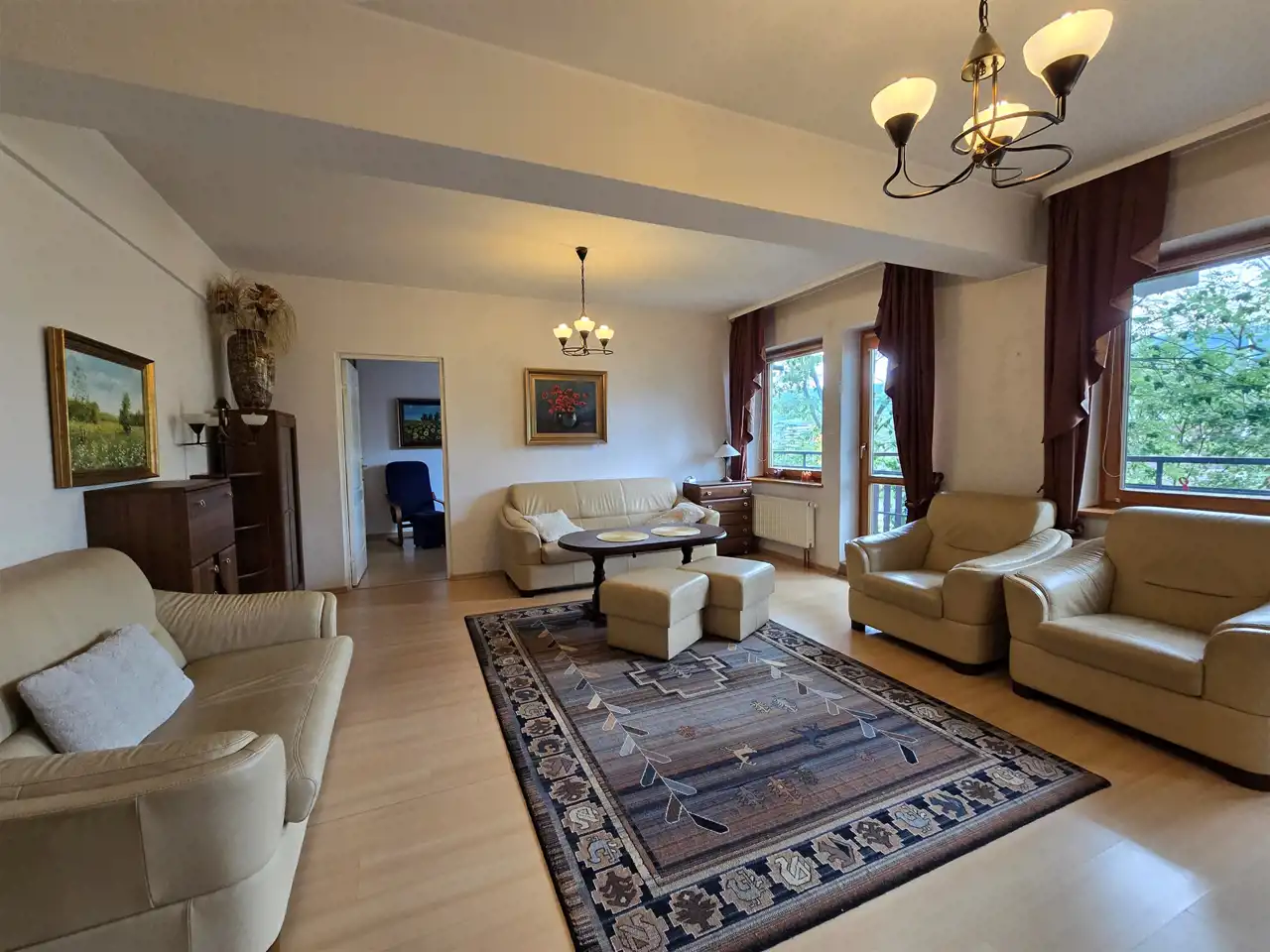 Układ: przestrony salon z wyjściem na balkon, dużą rozkładaną sową i fotelami,