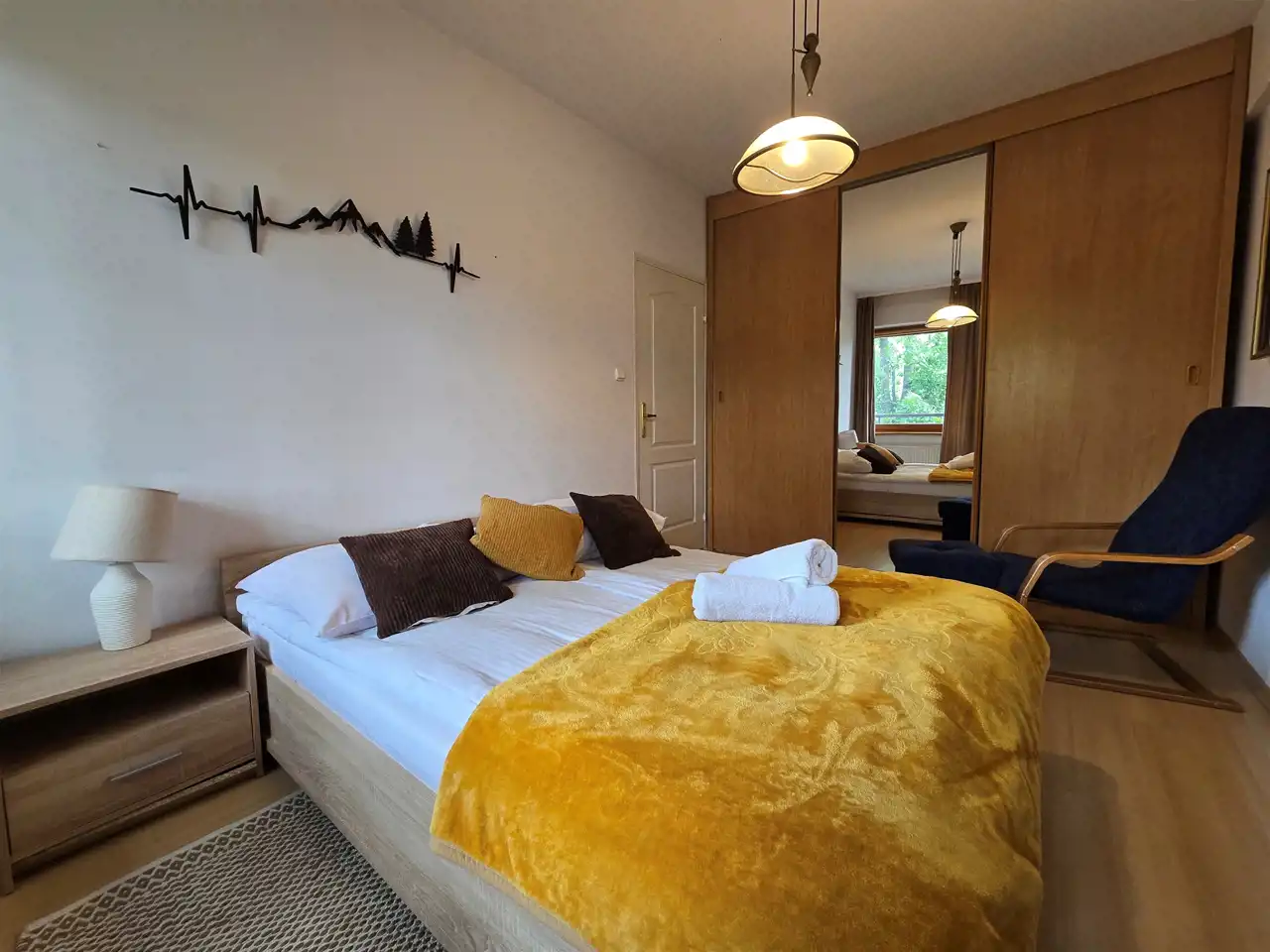- duża sypialnia z podwójnym łóżkiem, szafą i wyjściem na balkon,