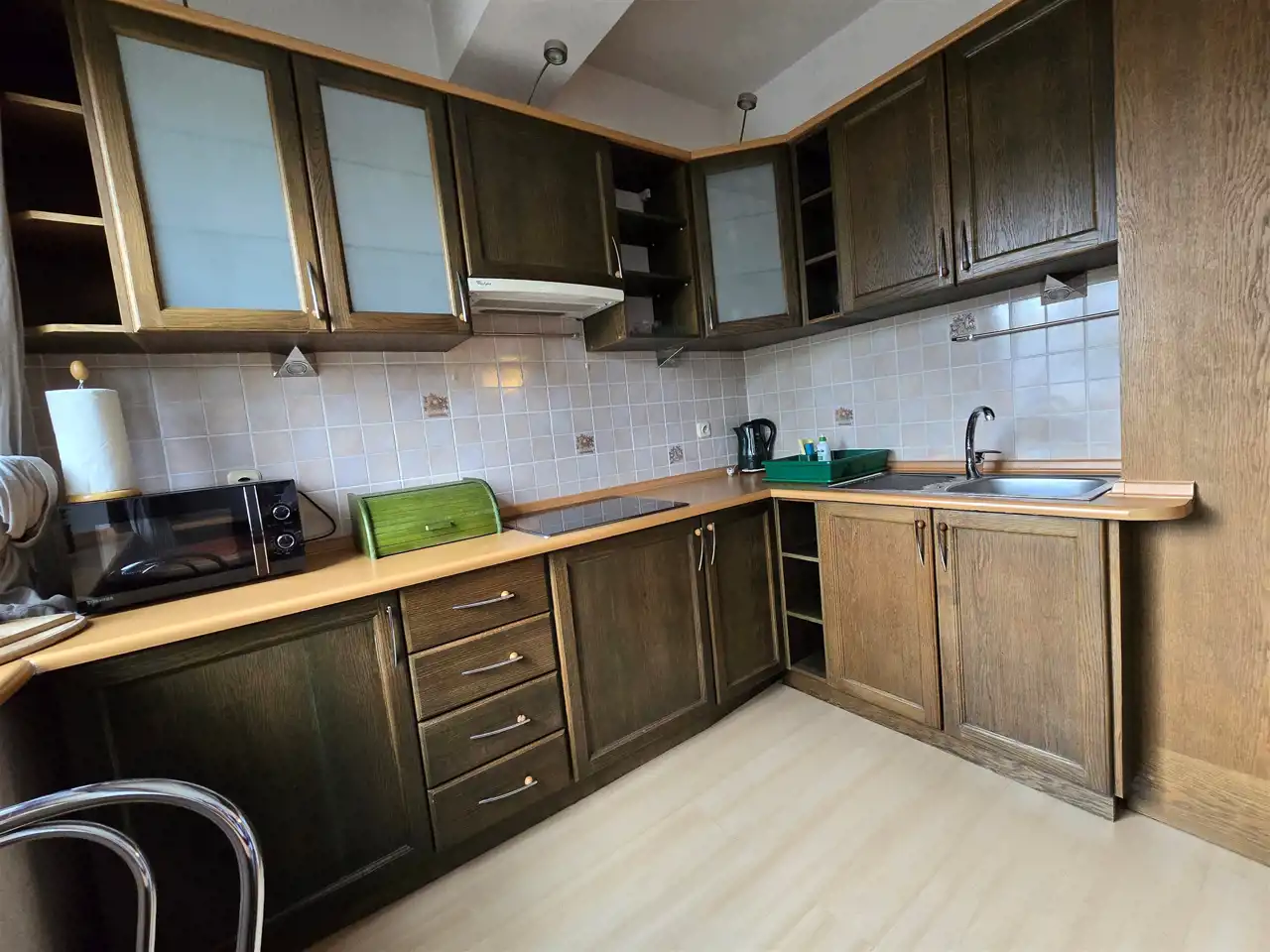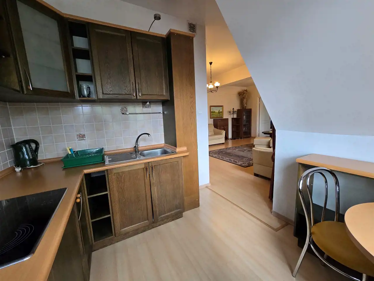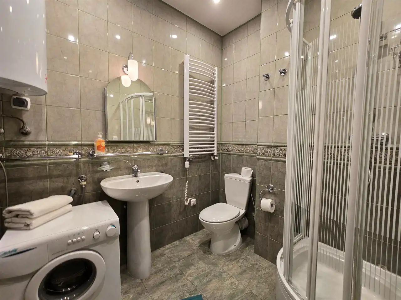 - kuchnia z lodówką, zmywarką i meblami w zabudowie, oraz przedpokój i łazienka z prysznicem i pralką.