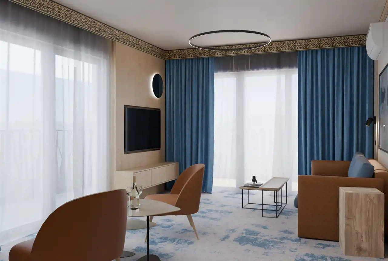W pokojach i apartamentach nie zabrakło tradycyjnych akcentów – naturalne tkaniny, regionalne dekoracje oraz drewniane wykończenia harmonijnie współgrają z nowoczesnymi udogodnieniami, takimi jak inteligentne systemy zarządzania, klimatyzacja czy wysokiej klasy wyposażenie.